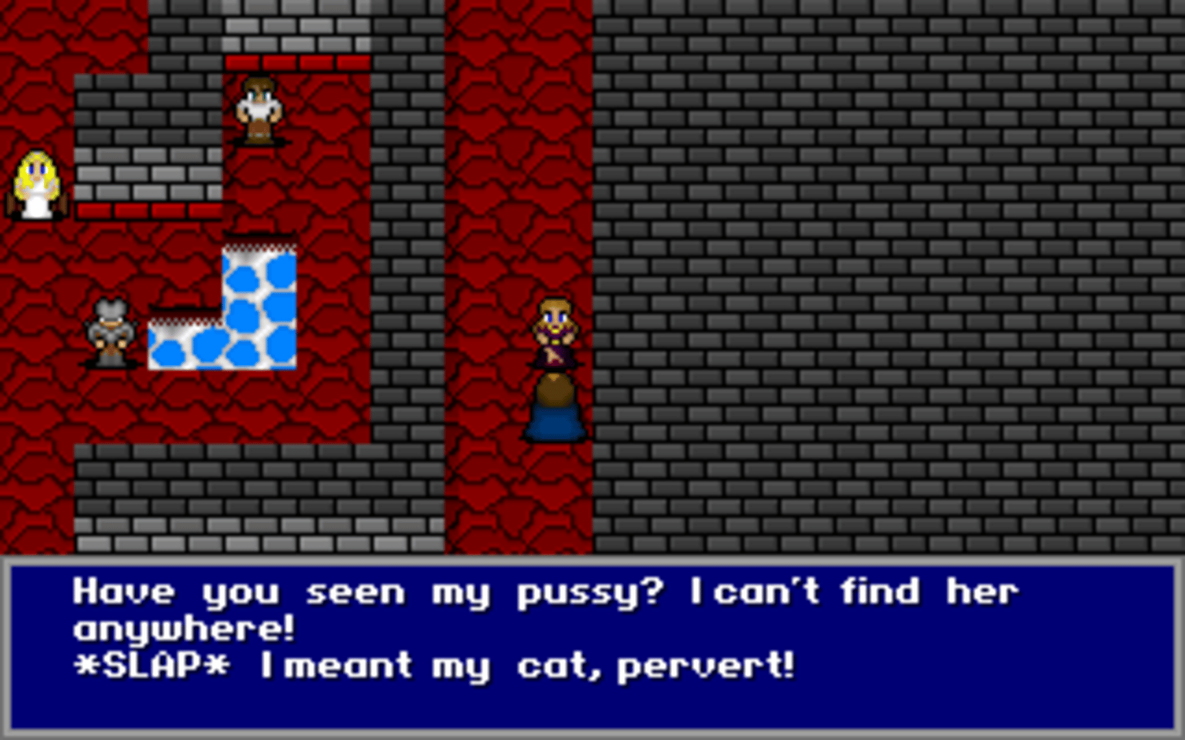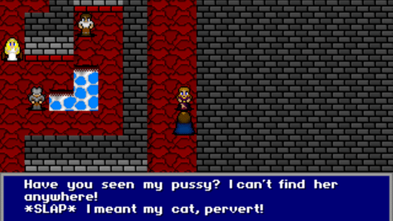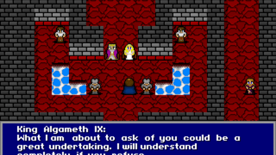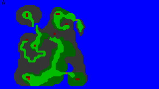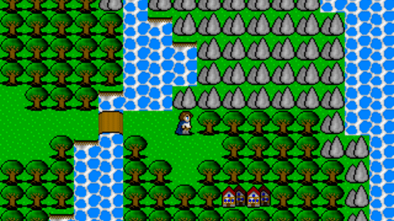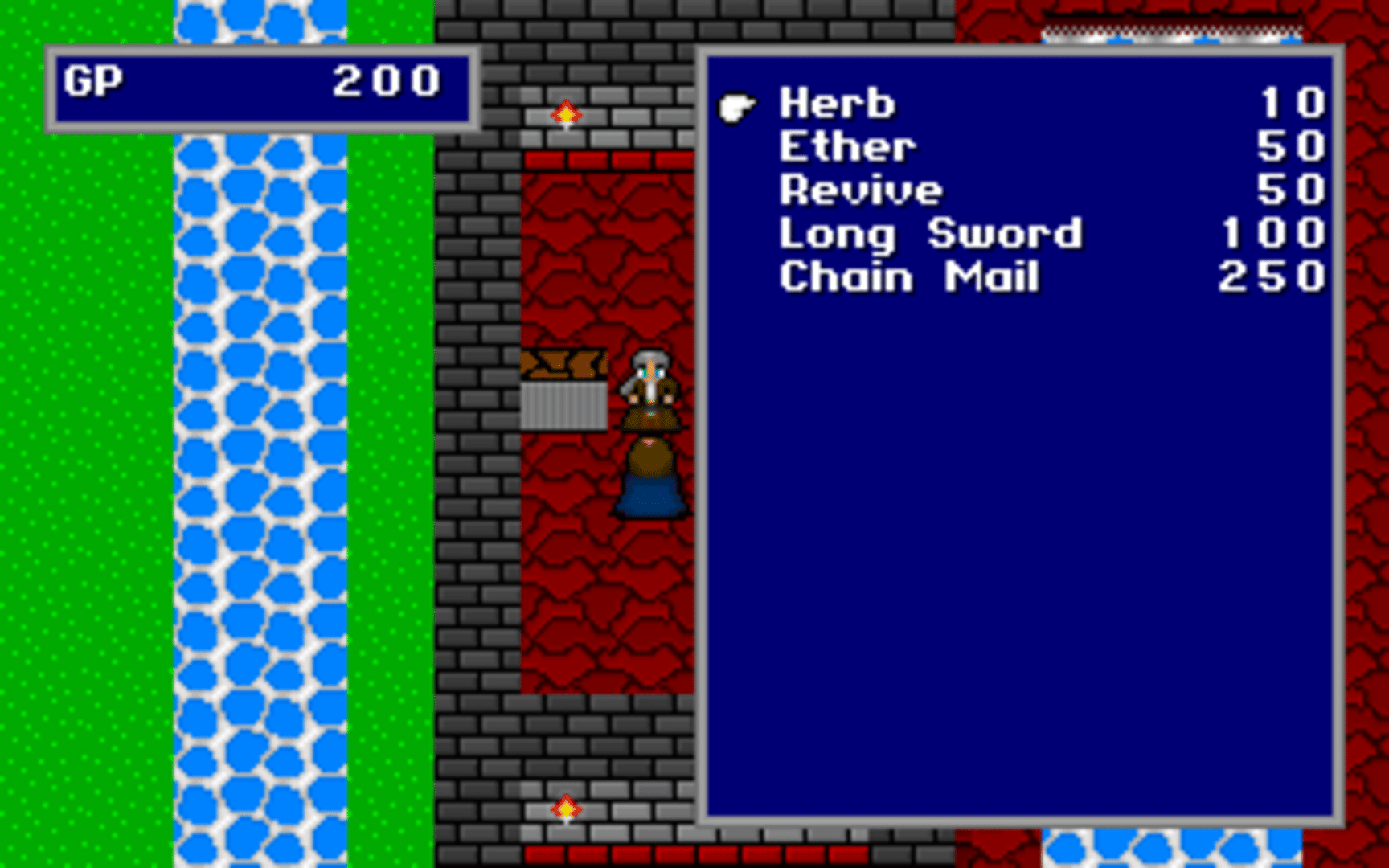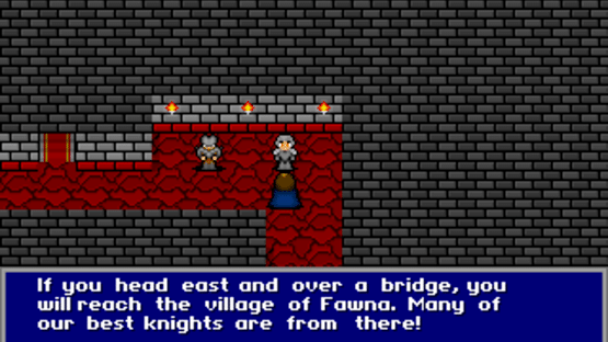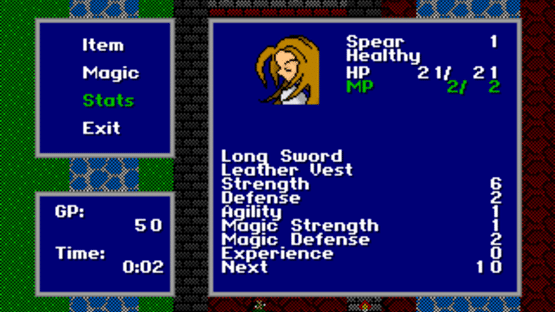 Mysterious Song is an RPG strongly influenced by the style of the early Final Fantasy games. Your character is a knight, sent by the king to investigate the trouble arising in the land, with the help of two other party members whom you pick up as you travel. The combat is turn-based, with a very simple magic system based on spell points. One party member is a mage, one specializes in physical combat, and your main character is a mix. There is no class selection, only leveling up.