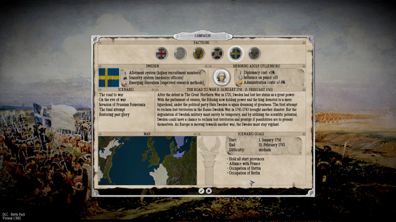 The Seven Years War (1756-1763) - Pomeranian WarONCE A GREAT NORTHERN EMPIRE, NOW DEGRADED. A FLEETING MOMENT IN HISTORY. A CHANCE TO RESTORE WHAT WAS LOST?- new playable nation: Sweden- 5 new campaign scenarios for Sweden, where you may attempt to lead the nation from 1750 all the way through the war, or go for historical goals in the...