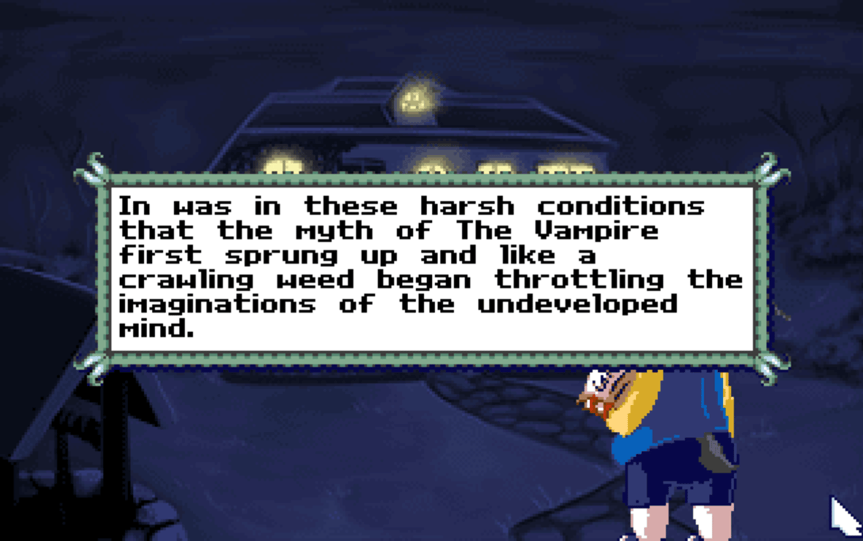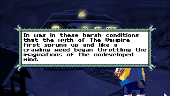 Featuring 8-bit graphics and MIDI music, Terror of the Vampire! takes place in the vaguely 19th century, in vaguely Eastern Europe, where a vampire menace grips the countryside! The menace of superstition and the belief that vampires exist! Join Dr. Ego Goodmind, BHD, as he does research for his newest psychology book, The Empirical Vampirical. But is he in over his incredibly big head this time?