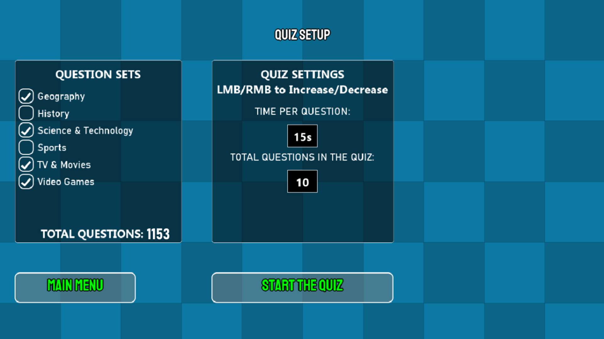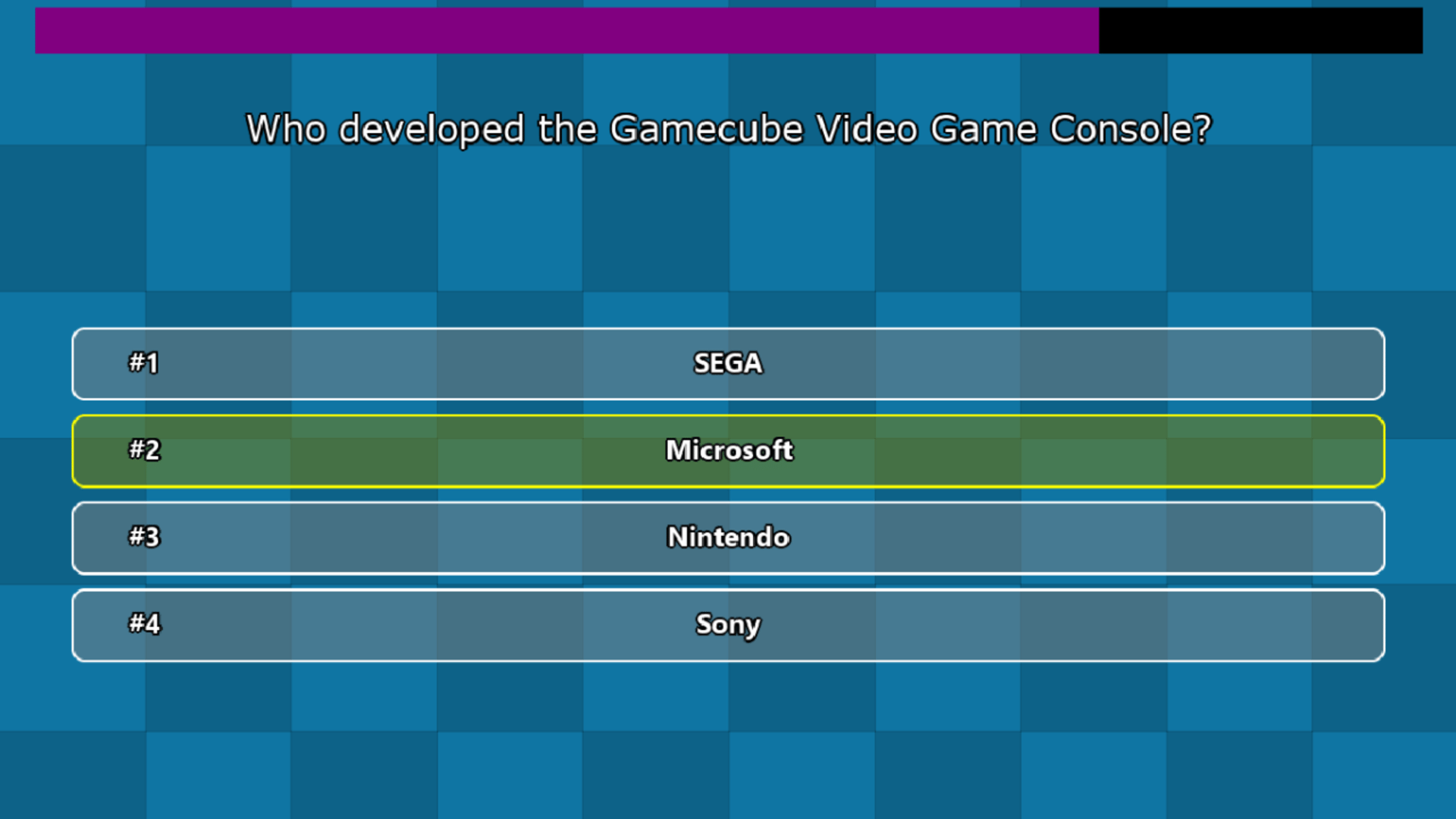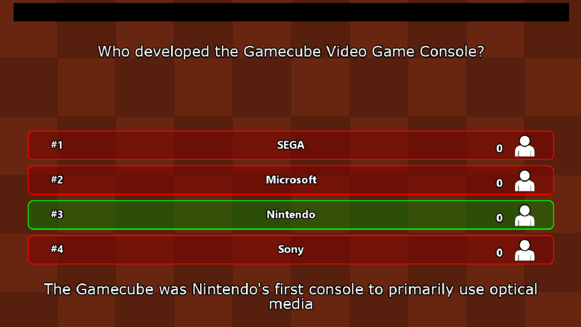 Quizee is a Trivia based party game that can be played locally with friends, or online with a Twitch community! If you're a streamer on Twitch, then get your community involved! Link the game with your Twitch chat, and your community can type their answers to the questions to compete to see who is the smartest in your community! If you want to play with your friends, hook up gamepads and play locally!