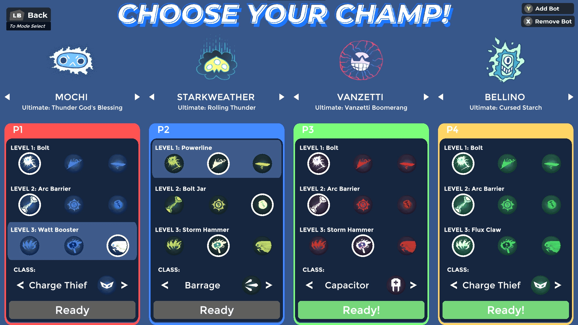 Charge Champs is a 2D platform fighter with a unique combat system where players charge their character to temporarily unlock abilities and gain an advantage over their opponents.