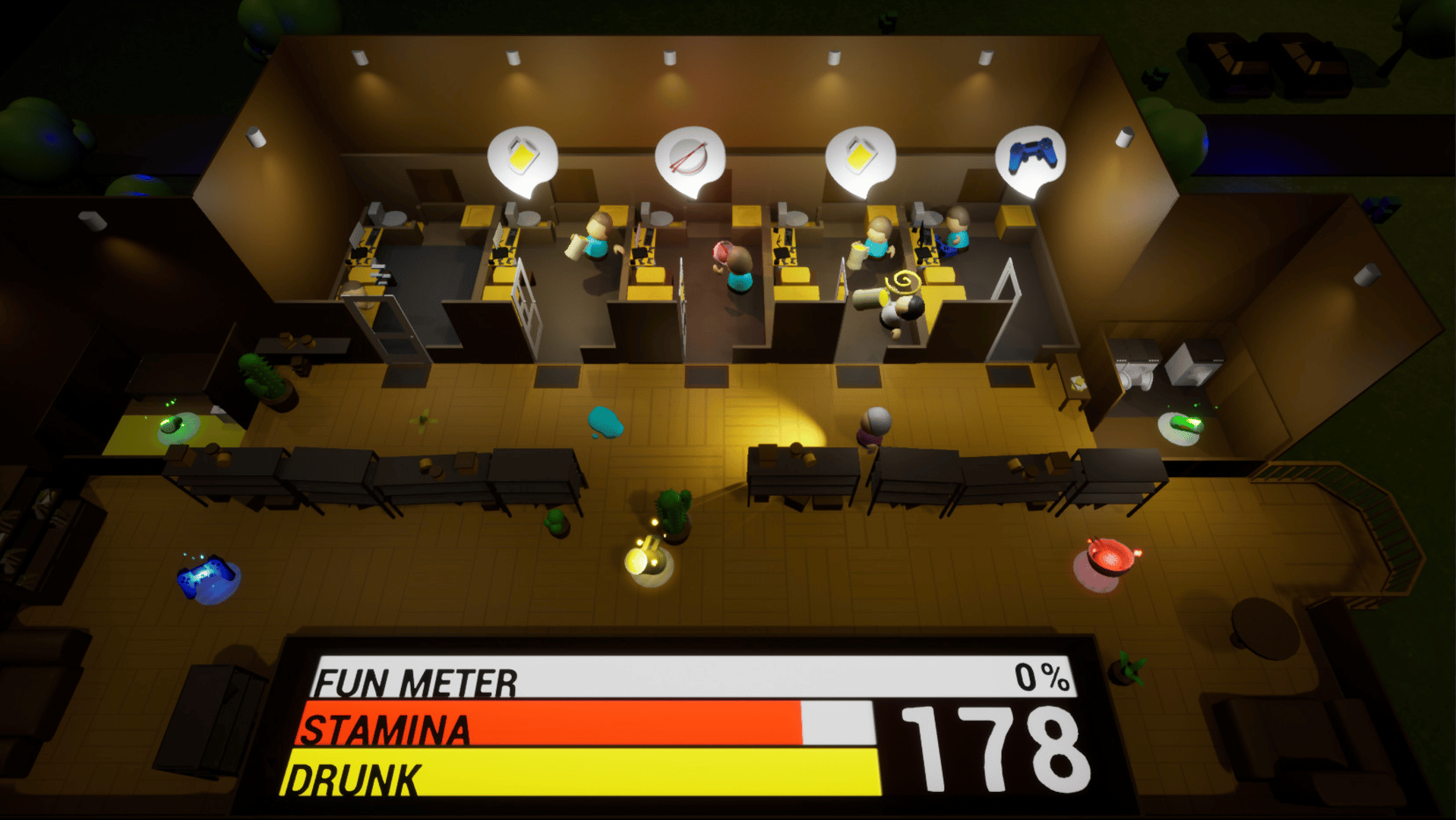 Balcony is a chaotic single-player top-down game that controls the character by keyboard. You will playing as a naughty student who sneak back into the university dormitory to party with your friend in order to make yourself strong enough to challenge DrunkGon in a drinking competition!!