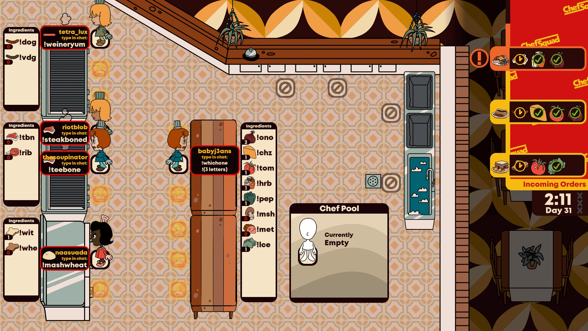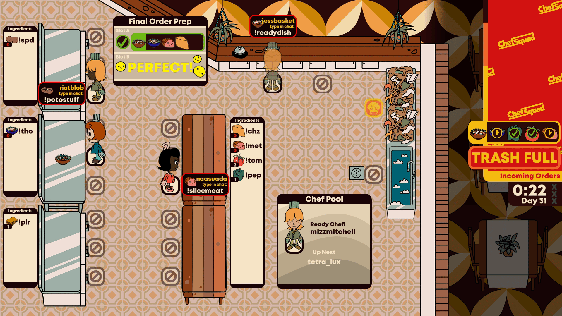In ChefSquad, a Twitch only online experience, chat plays as the cooks, while the streamer plays as the all-seeing, all-controlling head chef. Work together to get orders out quickly or you'll fail the day. Unlock new foods, challenges and more as you progress through the 6-8 hour campaign together as a community!