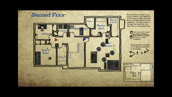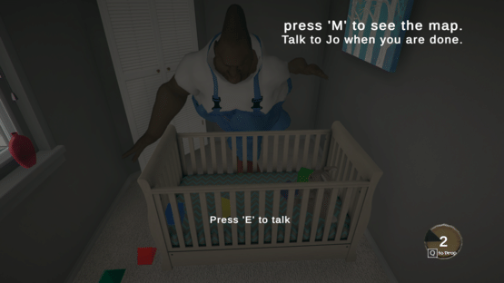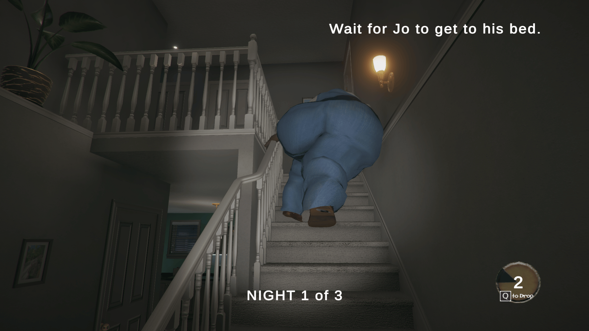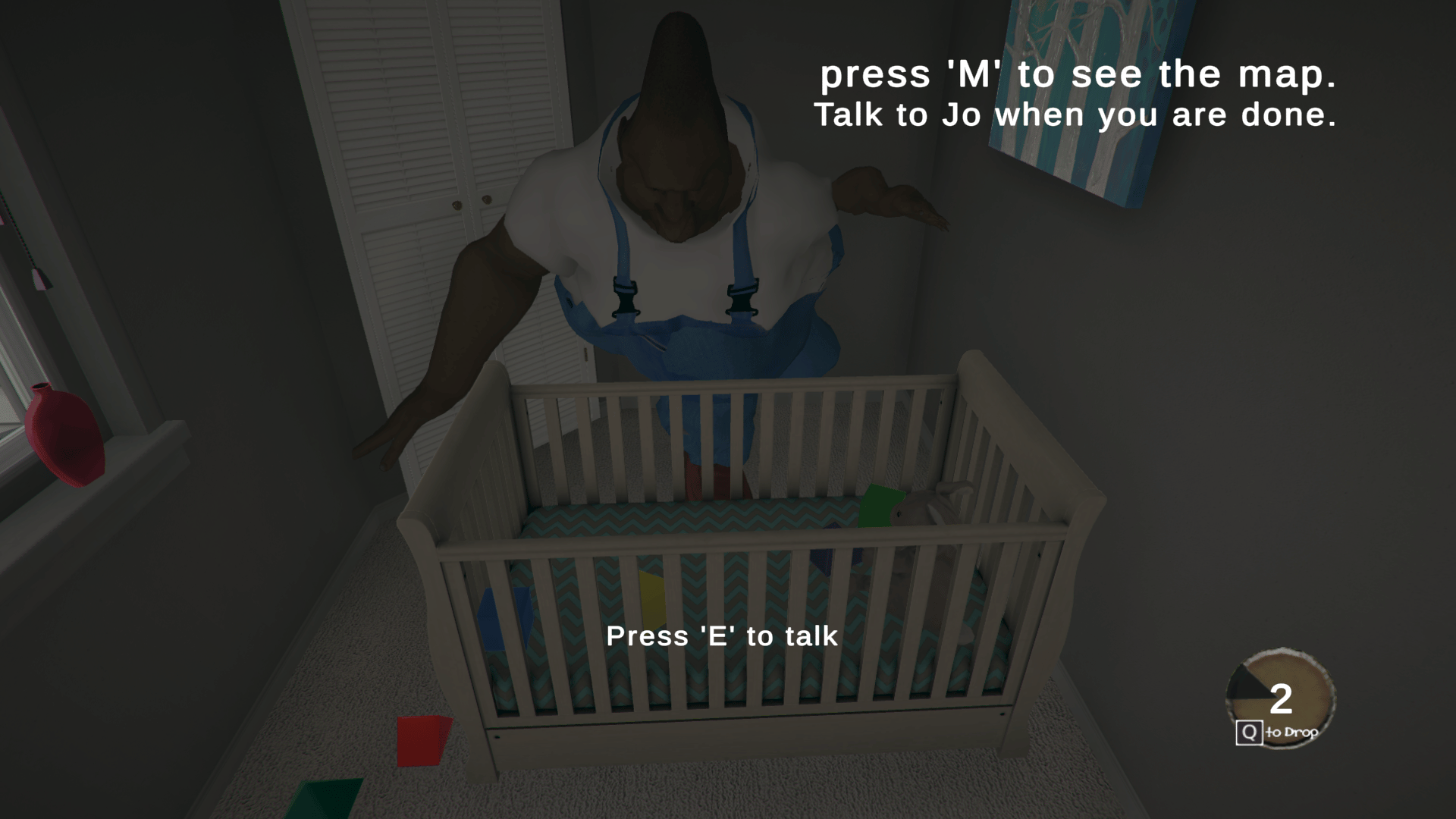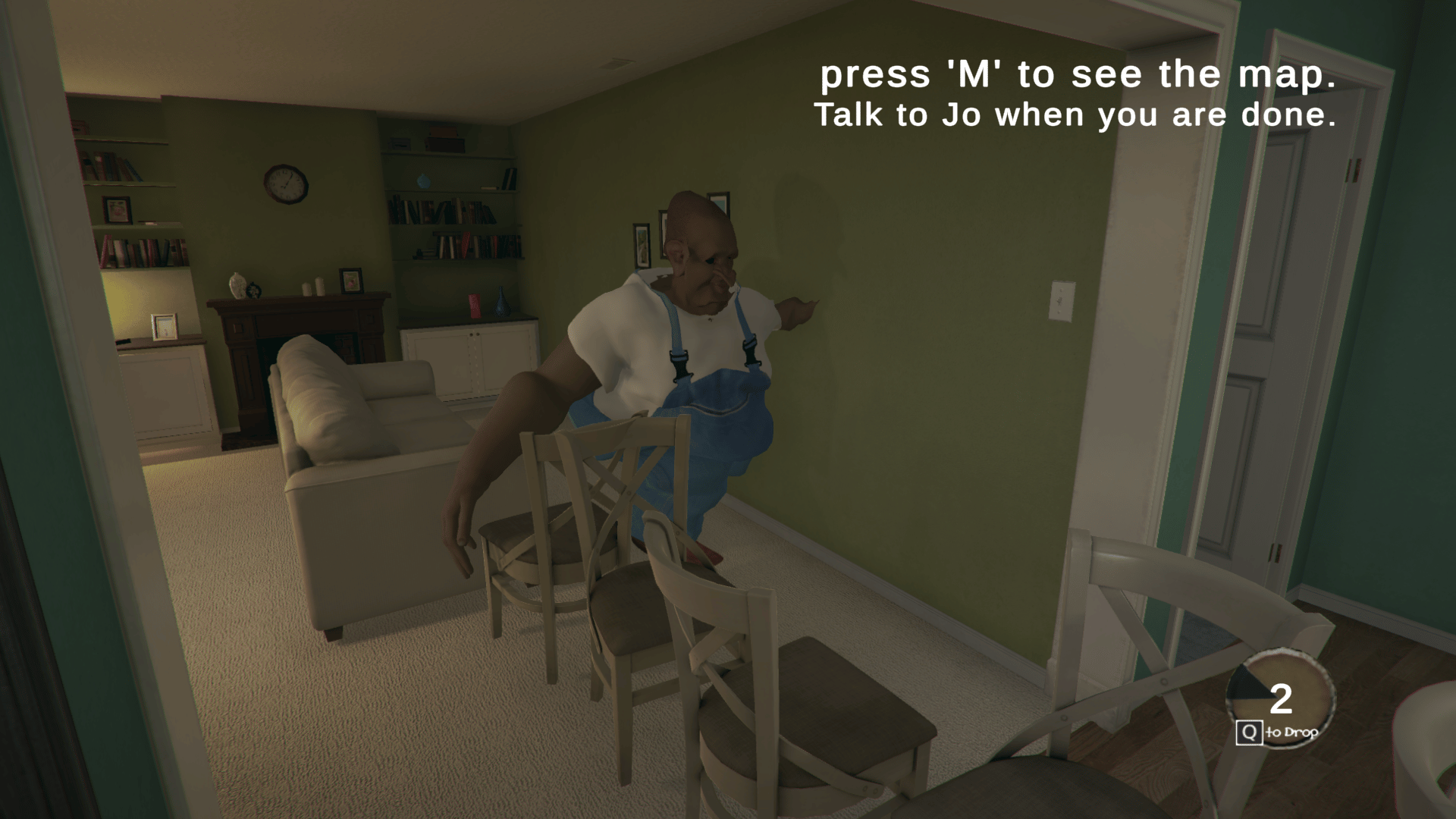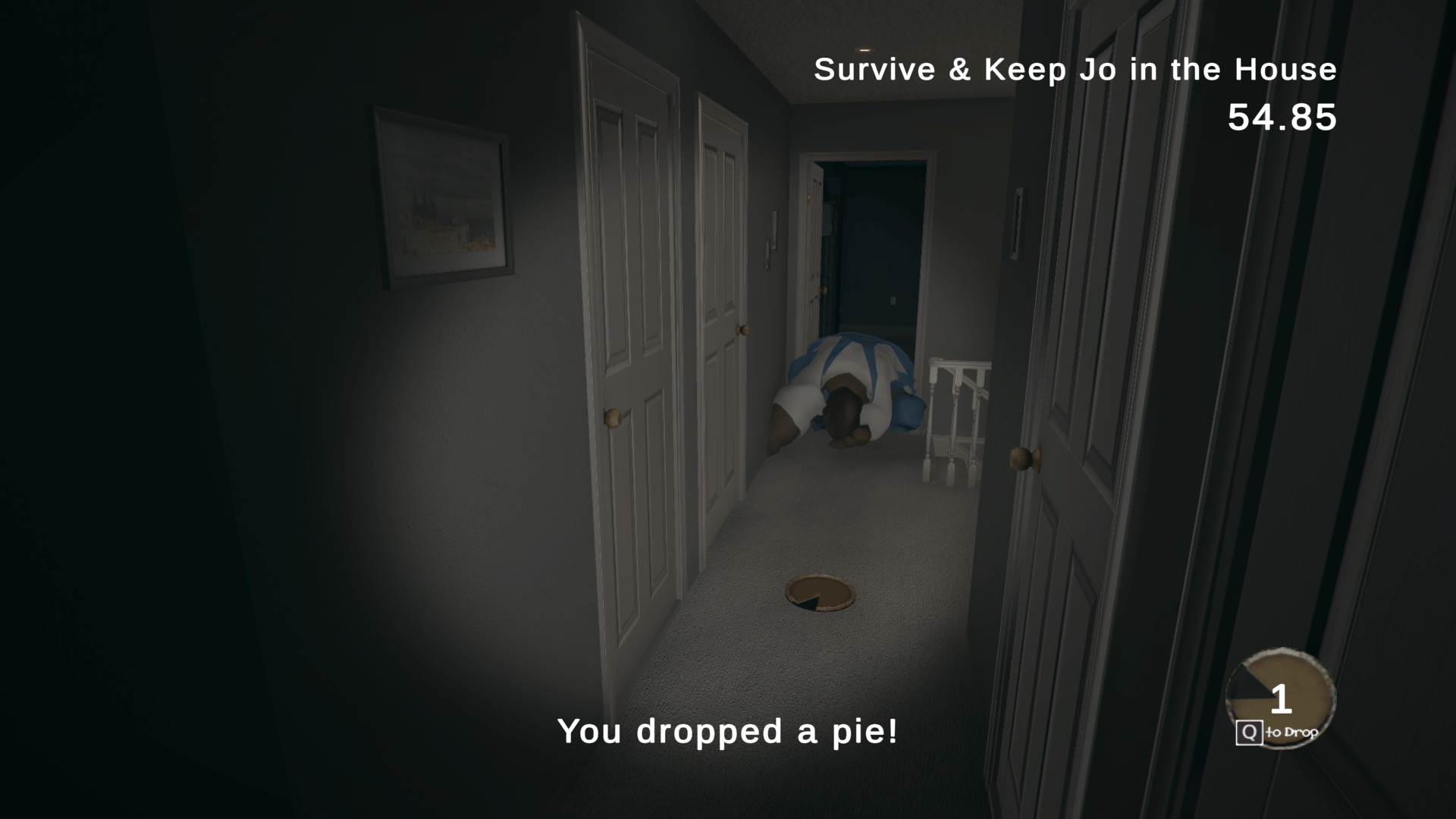 Jo's house is a maze building game where you must rearrange the furniture of the HQ Residential House to create the longest path from Jo's bed to one of the exits (front door, back door or garage). At night Jo will start rolling around the house to either attack you, eat a pie or exit the house. Your goal is to survive 3 nights doing the following 2 things: #1: Don't get hit by Jo. #2: Don't let Jo leave the house.