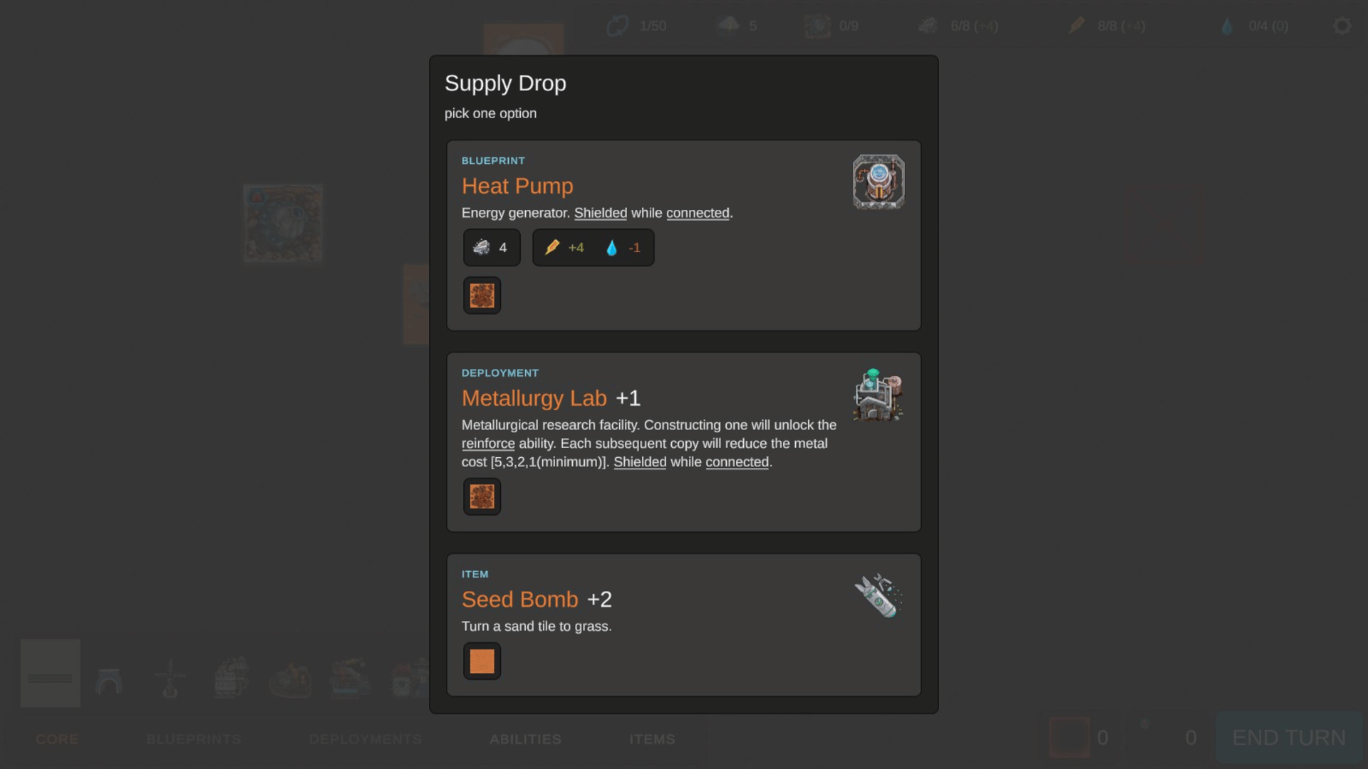 Wastelander is a minimalist turn-based colony building game with roguelike and deckbuilding elements, where you start from nothing as a castaway on an alien world, build your colony, collect resources and protect yourself from mysterious and destructive atmospheric storms while using the secrets of the alien ruins to find a way to escape. As your colony expands you'll find alien artifacts and buildings, perks, technology upgrades, and consumable items scattered across the map.