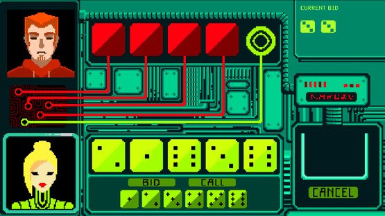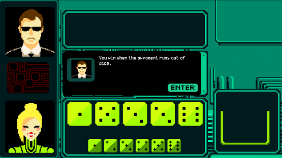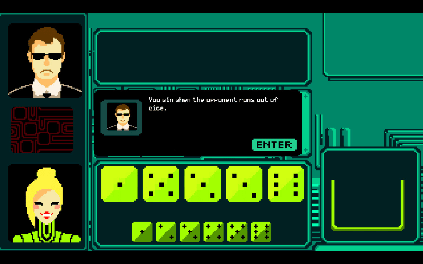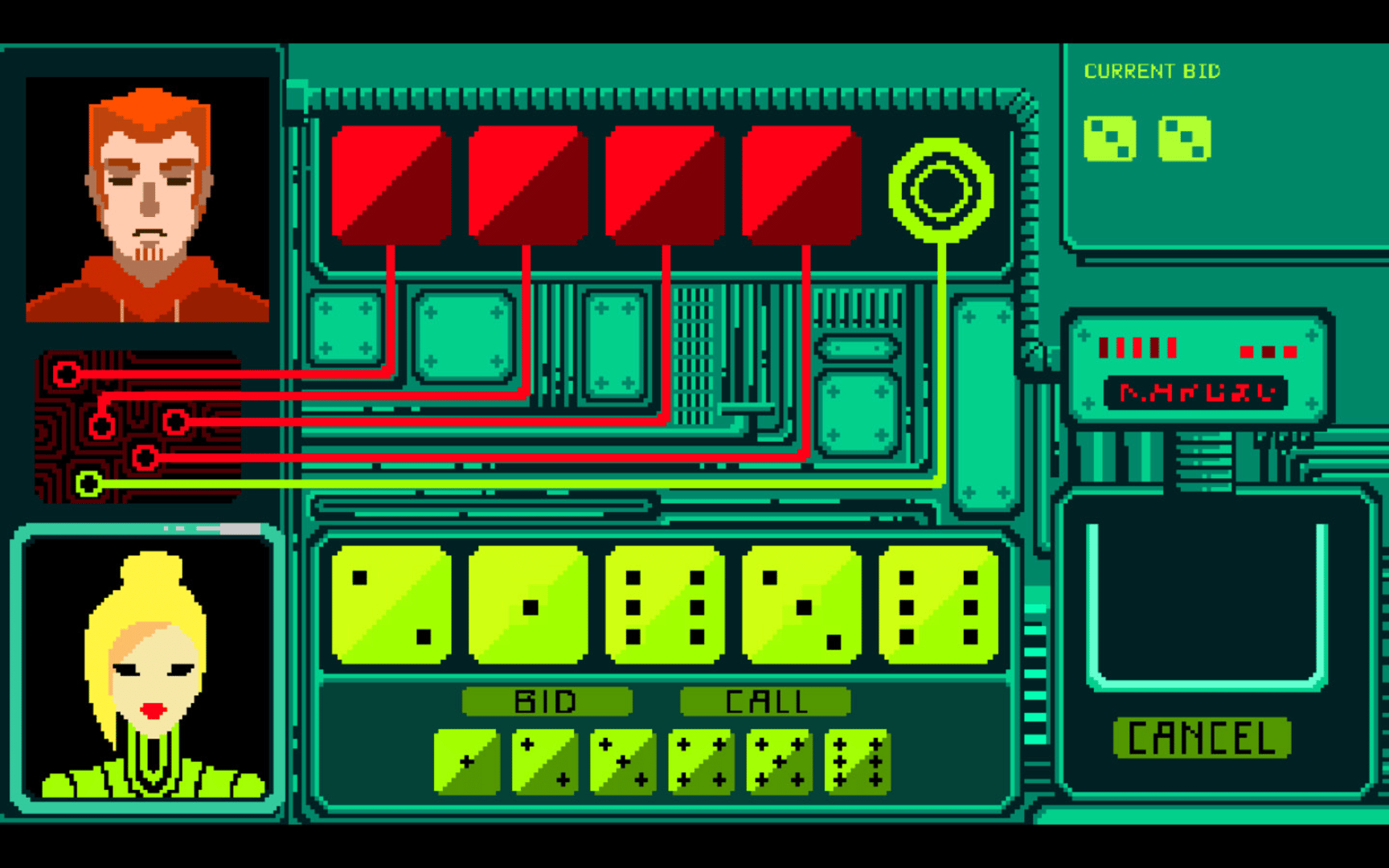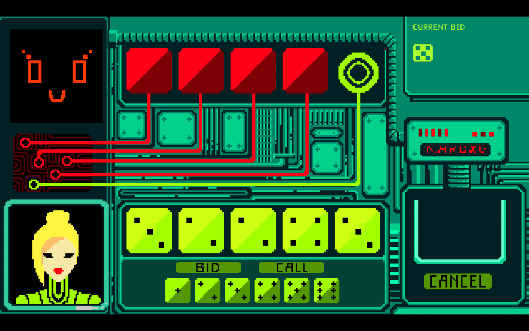 Maya's Dice is a 2D puzzle-based RPG using the bluffing dice game, Liar's Dice, as a unique and dynamic battle mechanic. Players experience a cyberpunk world and a narrative that questions morality and one's core values.