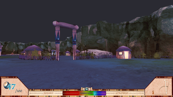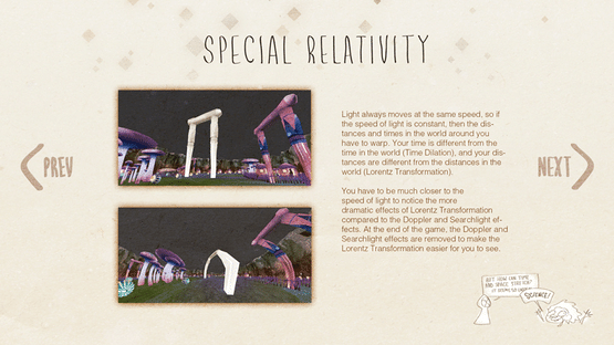 A Slower Speed of Light is a first-person game prototype in which players navigate a 3D space while picking up orbs that reduce the speed of light in increments. Custom-built, open-source relativistic graphics code allows the speed of light in the game to approach the player’s own maximum walking speed. Visual effects of special relativity gradually become apparent to the player, increasing the challenge of gameplay. These effects, rendered in realtime to vertex accuracy, include the Doppler effect (red- and blue-shifting of visible light, and the shifting of infrared and ultraviolet light into the visible spectrum); the searchlight effect (increased brightness in the direction of travel); time dilation (differences in the perceived passage of time from the player and the outside world); Lorentz transformation (warping of space at near-light speeds); and the runtime effect (the ability to see objects as they were in the past, due to the travel time of light). Players can choose to share their mastery and experience of the game through Twitter. A Slower Speed of Light combines accessible gameplay and a fantasy setting with theoretical and computational physics research to deliver an engaging and pedagogically rich experience.