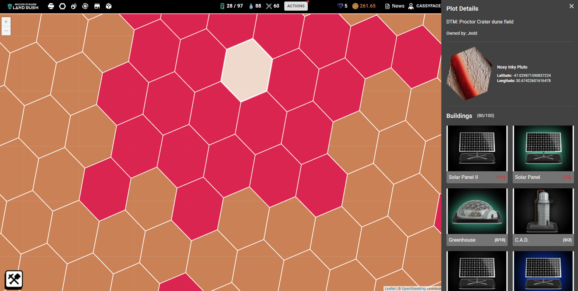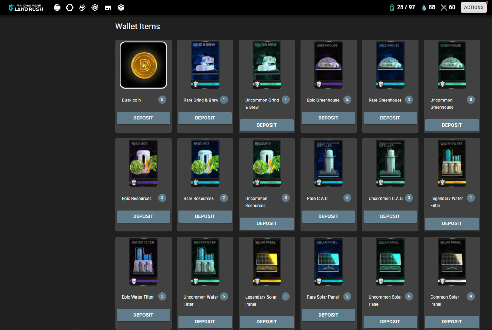 Million on Mars: Land Rush, is a 2D browser-based play-to-earn game that uses NFTs on the WAX blockchain. Players in Land Rush partner with DuskWorks co-founder Leon Dusk in a not-so-secret settlement just outside of the view of the Ad Astra Unlimited headquarters in Valles Marineris. Land Rush features similar elements of crafting and land development, but with a more simplified approach to realism and science, and a greater emphasis on creating a rich player-owned economy to support the game as it evolves. We see a future in which time spent playing games like Land Rush can not only be incredibly fun and engaging but also provide an economic opportunity for players who invest their time and resources skillfully.