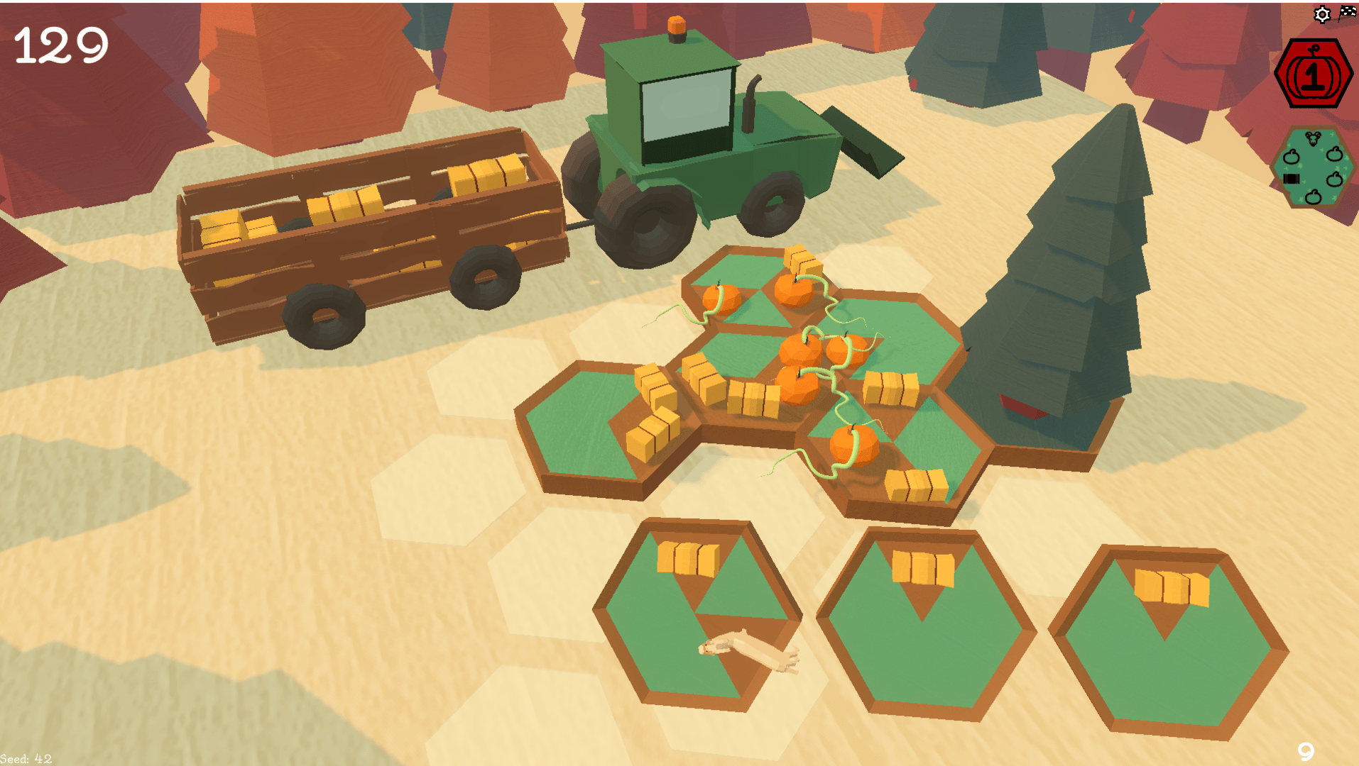 Hexagourds is a casual, relaxing builder and puzzle game where you place tiles on a grid to make your own pumpkin patch! Grow pumpkins, feed animals, and pick apples as you gain points for rotating, placing and connecting different tiles. If you're in love with the fall season or are in need of a relaxing game to distract you from the stressful day-to-day activities of life, then Hexagourds is definitely for you. This game has no winning or losing. You play at your own pace, gaining points for placing tiles wherever you want. You place some pumpkins here, some goats there, and haybales everywhere. This game was meant to be played on a chill, autumn Sunday morning with a coffee next to you. I hope you try it out and enjoy the game. For those more strategically inclined, there is definitely some strategy involved with maximizing points. I've added dailies and a mutliplayer scoreboard if you want to show the rest of the community your sweet score in Hexagourds. But that's all up to you.