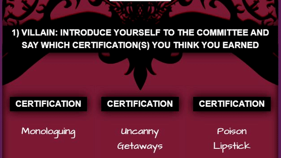 Tell silly stories about aspiring villains accepting unlikely quests to earn dubious certifications in evildoing skills.