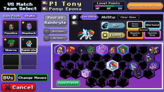 A super-powered, shapeshifting pony RPG. Command a super-powered, shape-shifting pony in this RPG Adventure! In a world where unpredictable legendary beasts pose an existential threat, you'll embark on a journey across the Pinto region to become the best pony tamer in the world and protect your magical companion from those who want to use her as a secret weapon. Customize your team with hundreds of different moves, stat arrangements, & collectible battle gear to gain the upper hand in this rapid-switchout Rock/Paper/Scissors combat system. A years-in-the-making love letter to the My Little Pony & Pokémon communities, celebrating one year of progress since the successful Kickstarter campaign!