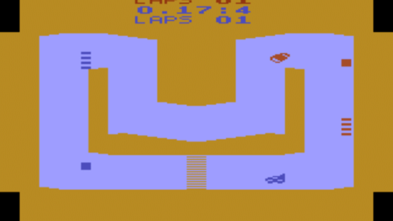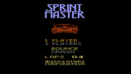 Sprintmaster is an action racing game for the Atari 2600. The game is played with an overhead view of the racetrack, and the first of two players to race around the track for the required number of laps wins! Occasionally a bonus will appear in the roadway; collect these to increase the traction capabilities of your car or gain a temporary speed boost. Other obstacles, such as oil slicks, may also appear in the roadway which will cause you to lose control and speed. There is a total of nine different tracks with varying levels of difficulty to race on, and you can choose either blacktop, dirt, or ice for terrain.