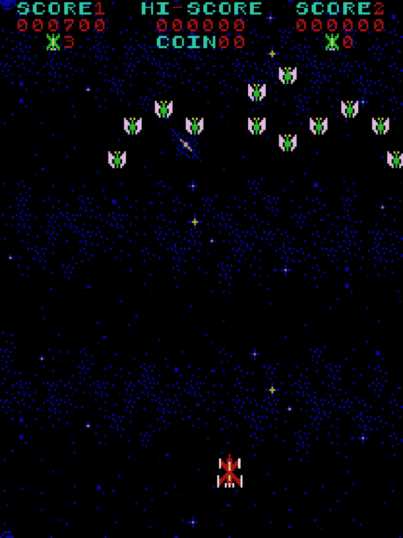 In this shoot 'em up the player has to fight off four assault waves consisting of different enemy types until he reaches a huge UFO. After destroying the protective plates guarding the UFO's pilot in his cockpit the player can kill the pilot. The game starts anew with harder enemies.