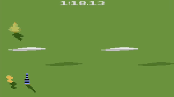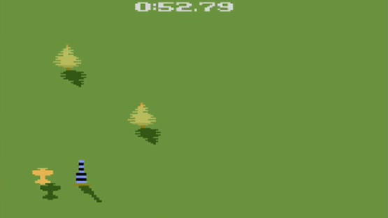 You control a small plane and have to fly slalom around a preset amount of pylons. You have to pass the red pylons on the right side and the blue ones on the left side. Missing a pylon will result in a three second penalty. Flying into the pylons, trees or hot-air balloons will cost you time as well. There are five different game modes: The first four game modes only differ in terms of the number of pylons you have to pass (25, 50, 75, 99). In th fifth game mode you still have to pass 99 pylons but they are placed along the course randomly. You can also change the difficulty level from easy to hard which will place obstacles like trees either directly in your line of flight or out of your way.