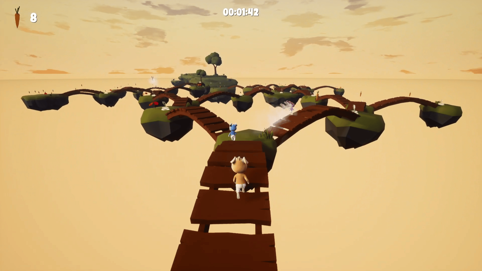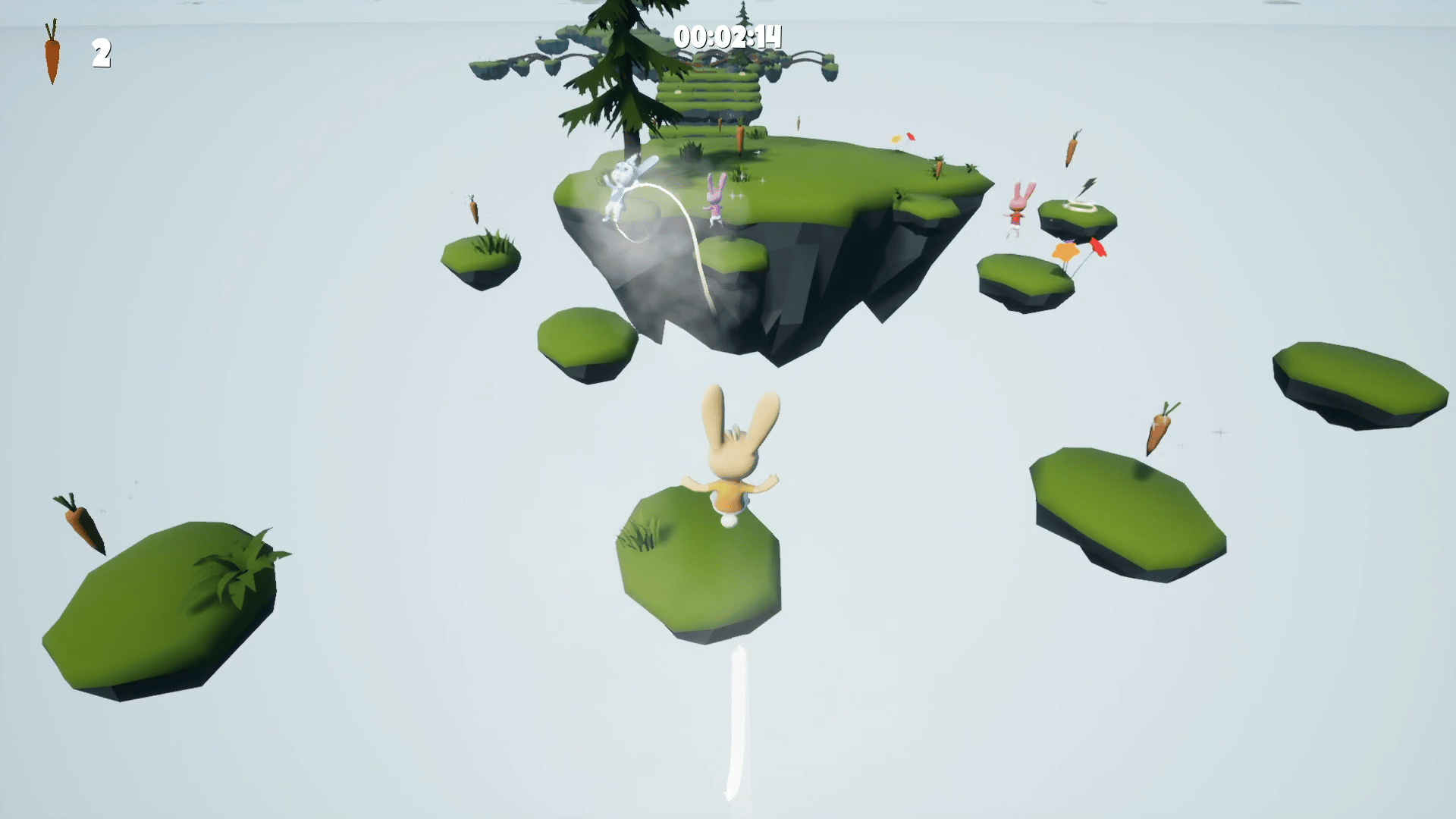 Race against your friends in a colorful platform world. Take the boost to run faster or find the shortest path to be the first bunny to reach the goal. Choose between 8 different levels. Collect carrots to get higher score!