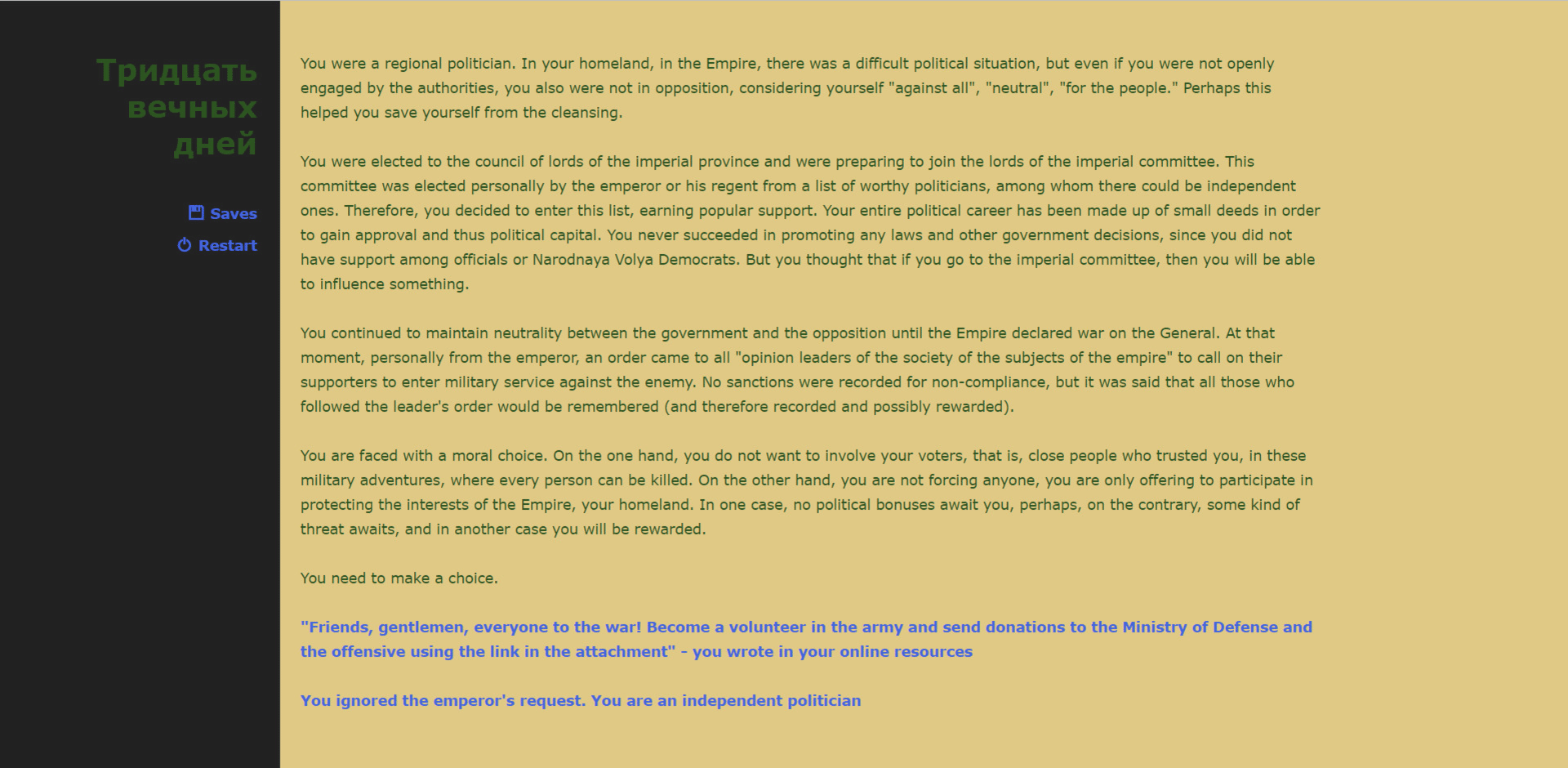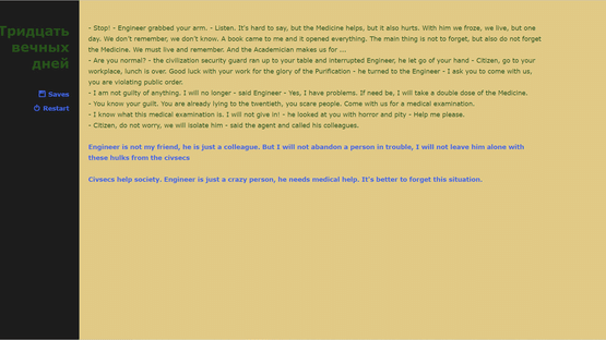 Touch the world after the Catastrophe. Remember your life, which has become almost endless. Repent of your past and try to save the future in this sci-fi text-based interactive adventure game.