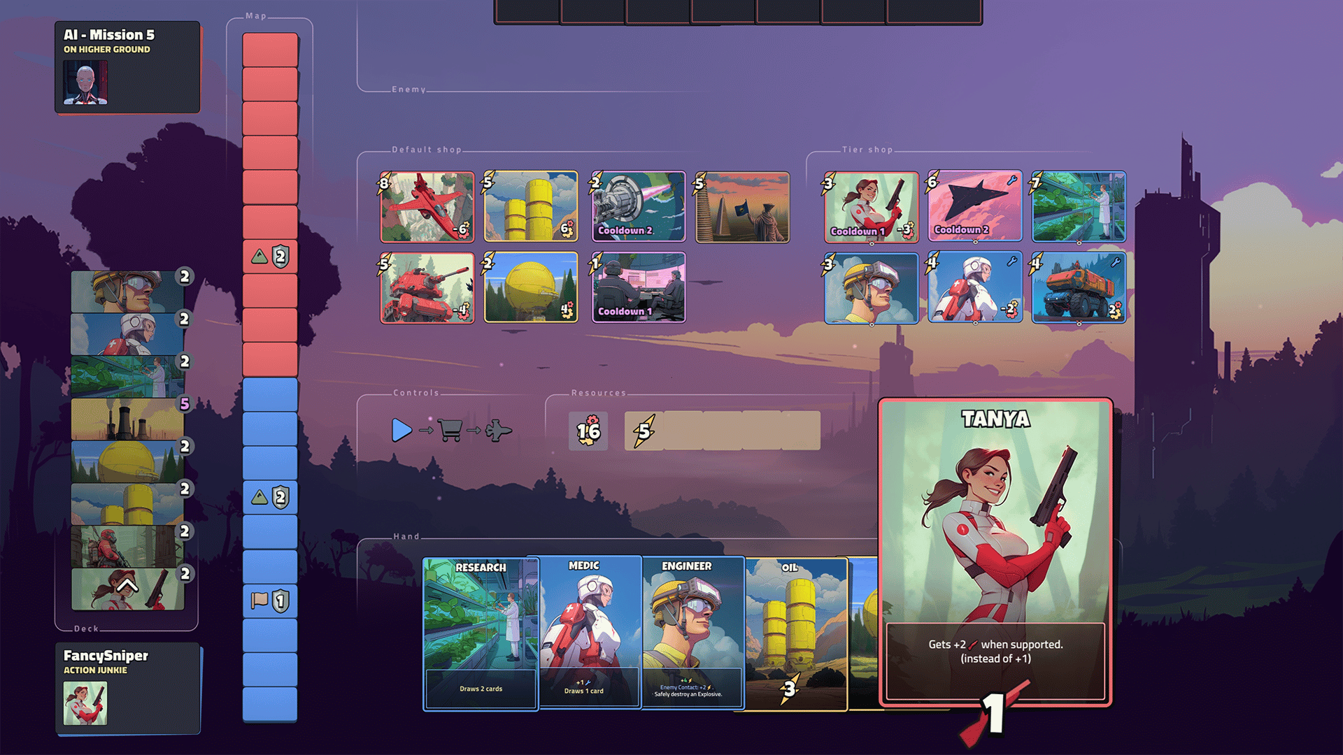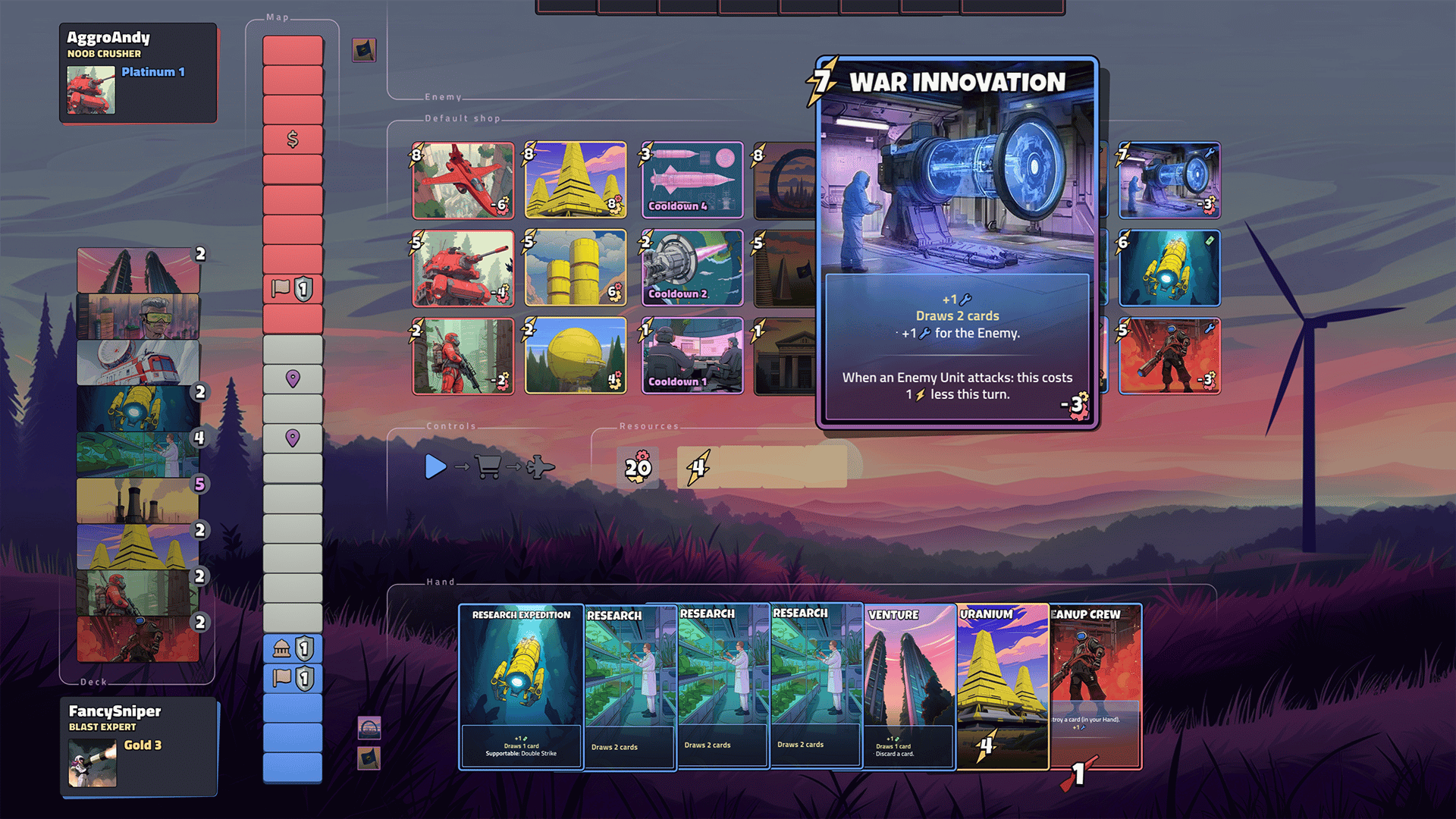 Tuggowar is the big-brain deckbuilding duel. Engage in tense combat on a solarpunk frontier. Assemble your deck turn by turn, discover powerful card combos, disrupt the enemy strategy, and pilot your well-oiled war machine to victory!