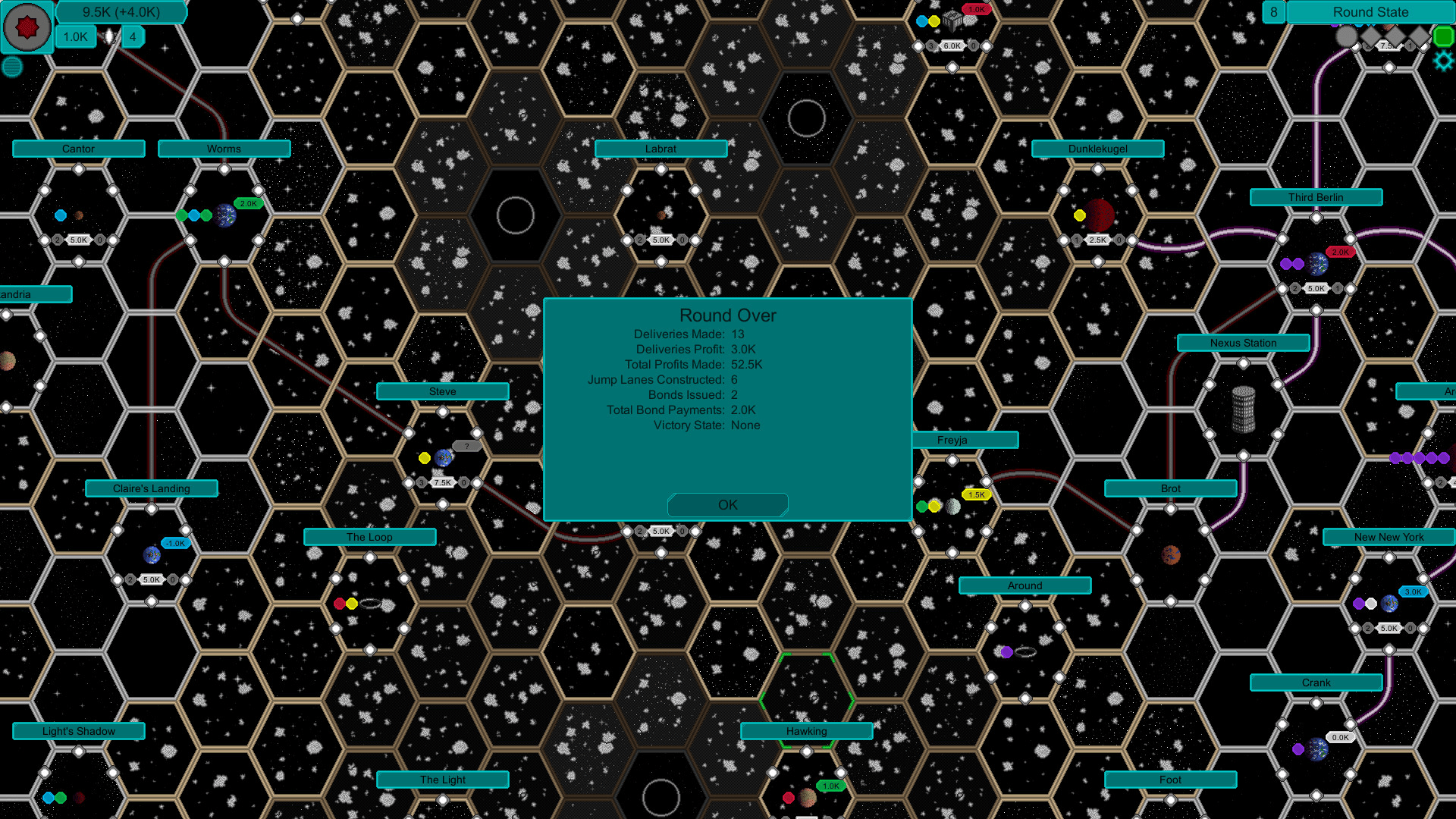 Jump Lanes is a science fiction turn based game about shipping lanes in space. Make wild profits by getting to the best opportunities first. The primary inspiration is train-based board games. If you enjoy those then this game was made for you.