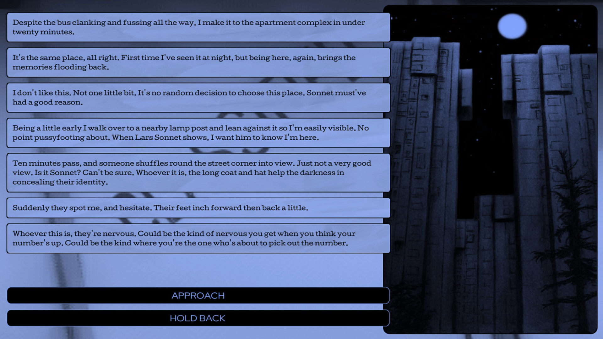 A detective noir, choose-your-own-adventure game with hand-drawn art, over 250k words, and an immersive soundtrack.