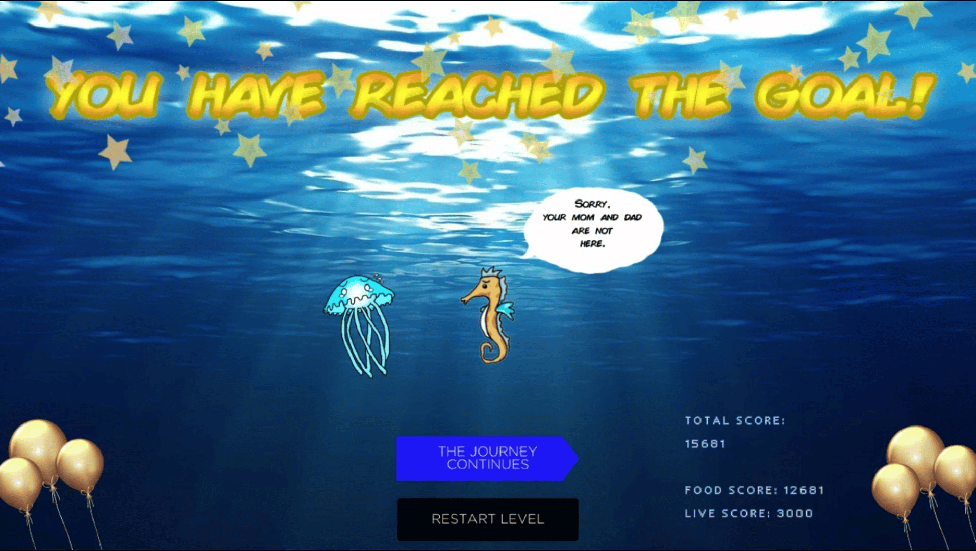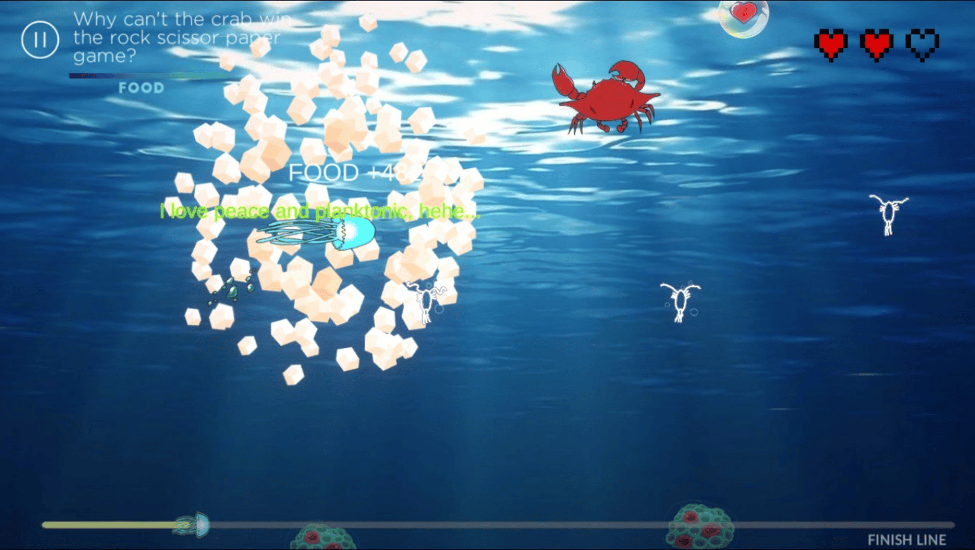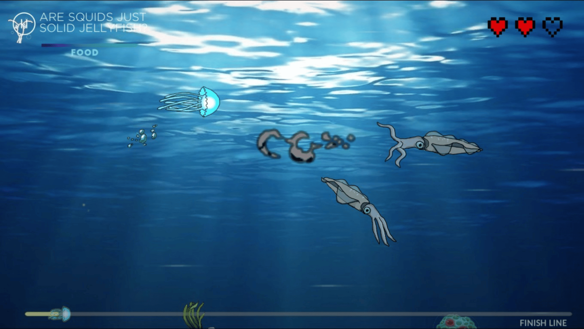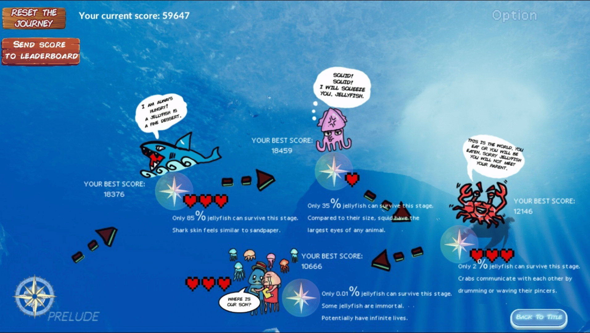 A very short and memorable adventure of this above jellyfish kid to finding his parents. Use your mouse click to avoid the sea predators and eat planktonics. The story is a little cringey but will make you smile in the end.