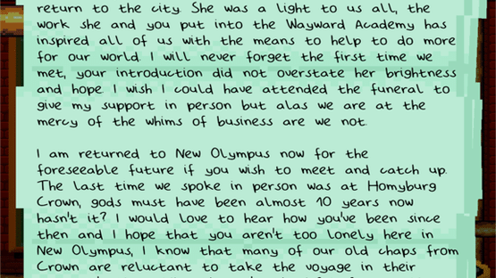 Play as one of the mailroom operators at the Hotel Hermes, a prestigious hotel in the swanky part of New Olympus. Your job is to ensure mail arrives at the right place at the right time and to accomplish this you have to master the archaic and eccentric system used by the hotel. In order to ensure mail reaches the right place, you will have to learn about the guests of the hotel, the upper management, fellow mail clerks, as well as the world at large. As you play the letters you send will change the world around you. Hopefully for the best!