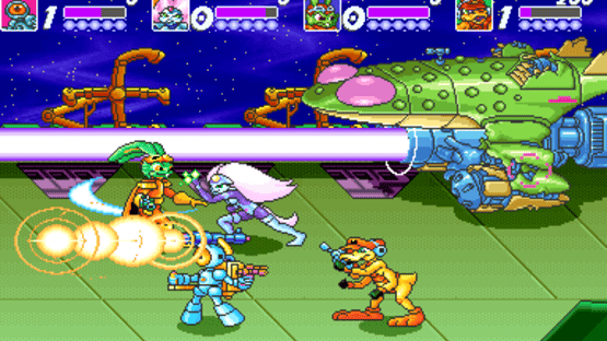 This video game is based on the cartoon television series Bucky O'Hare and the Toad Wars under license from Hasbro, Inc. While it is generally classified as a scrolling fighting game, utilizing a Final Fight-esque landscape, the player's character is also armed with a laser gun, adding in elements of a scrolling shooter. However, if the character is extremely close to an enemy, he will throw out his fists to attack - a precursor to the characters featured in Metal Slug, who use knives in close combat. Much like the cartoon, Bucky O'Hare features colorful animation, and voice actors from the series were hired to participate in the game's cut scenes. The player chooses from five protagonists: Bucky O'Hare, the heroic rabbit captain of the space ship Righteous Indignation; Jenny, an "Aldebaran cat" and telepath; Dead-Eye Duck, a four-armed mallard; Willy, a kid from earth that replaced their engineer, and Blinky, a one-eyed android. As in the television series, the characters must stop the Toad Empire from invading extraterrestrial planets and enslaving their peoples; to do so they must shoot their way through an army of brainwashed toads to destroy their evil leader, a computer program known as "Komplex" and release the "Interplanetary Life Force." The enemies, among them Al Negator, Toadborg, Total Terror Toad, a "Cyborg Spider", the various varieties of Toad Storm Troopers, the Toads' Air Marshall, and "Komplex-2-Go" who featured in the comic book and cartoon series continuities.
