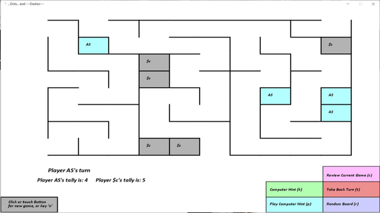 A rendition of the pen and paper classic game of Dots and Dashes. Player settable board size, with ability to to play against other players, or the program or both. Seven computer playing levels will allow players of all skill levels to enjoy the game. Leader boards are available to record wins.