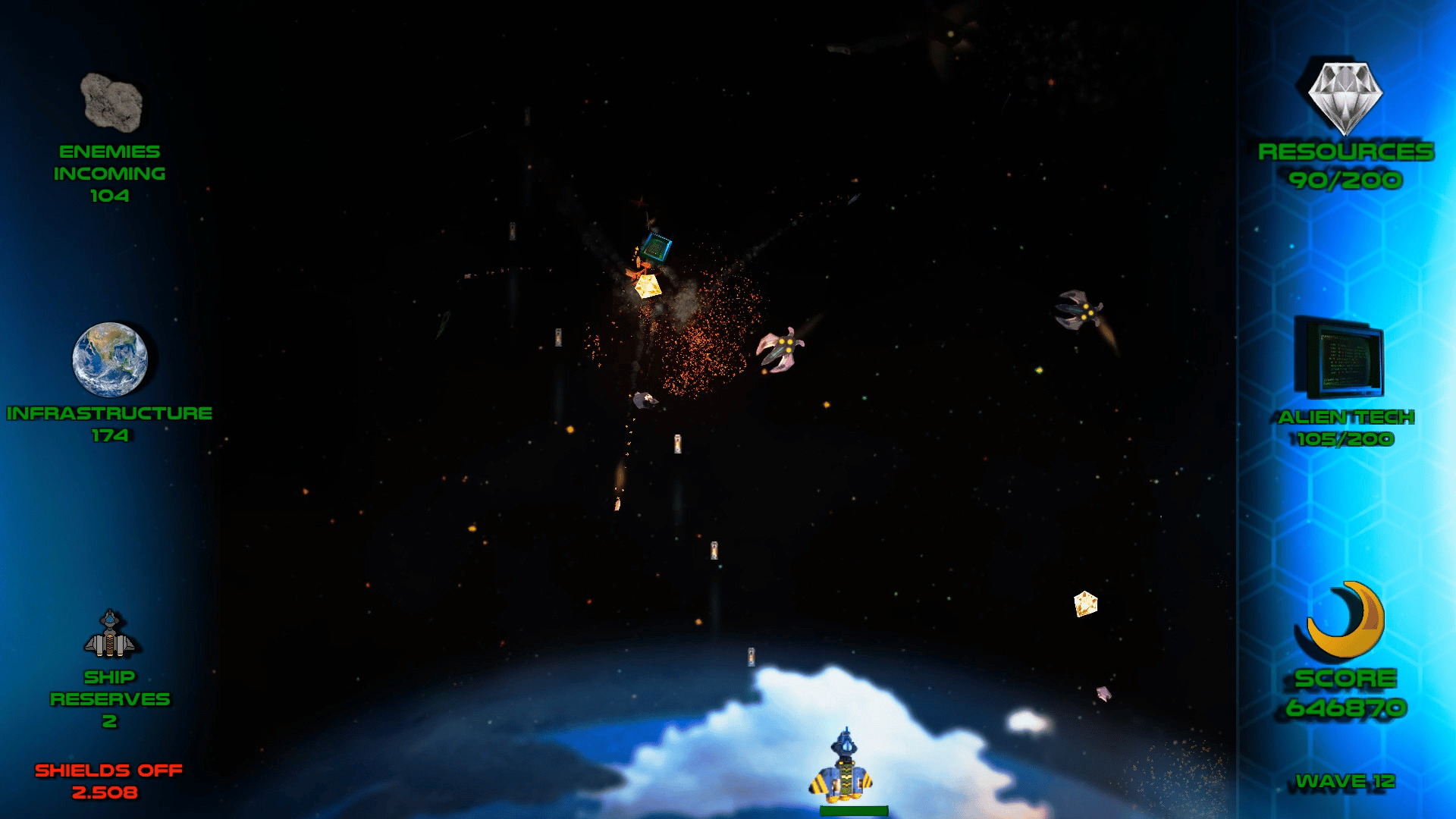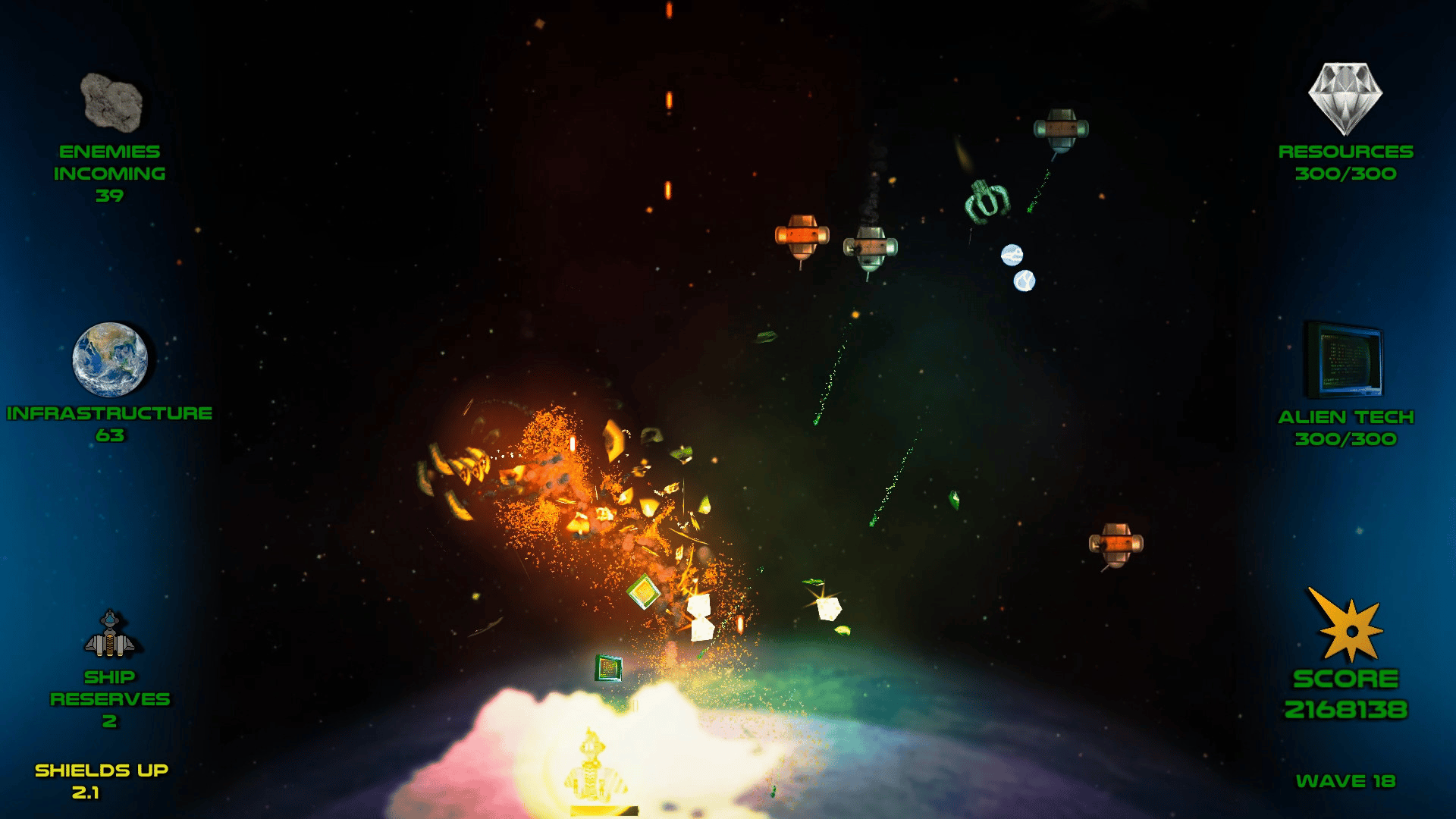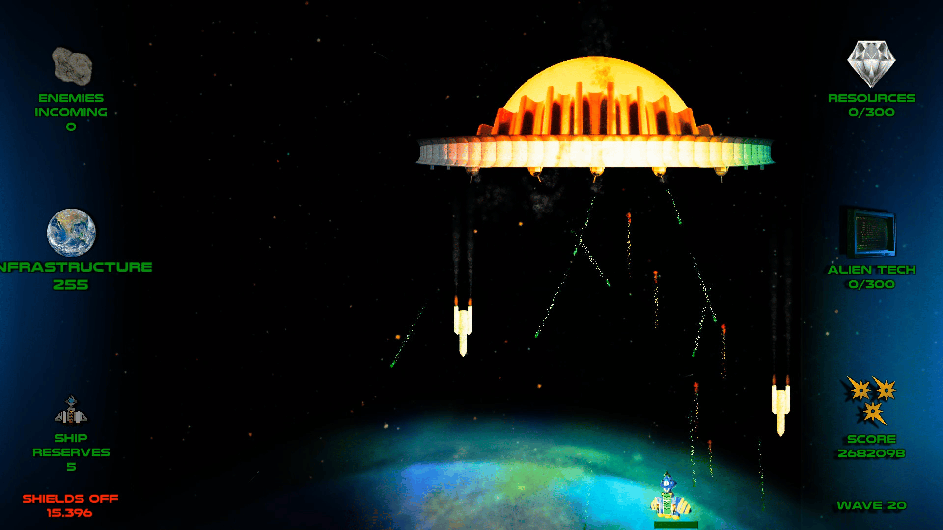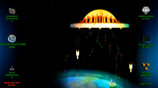 Stop the Saturnians is a shooter inspired by classic arcade games. Dodge enemy fire, destroy procedurally generated alien waves and fight massive bosses. Collect resources in the midst of combat to upgrade your ship or improve Earth's defenses. Protect yourself and the planet both!