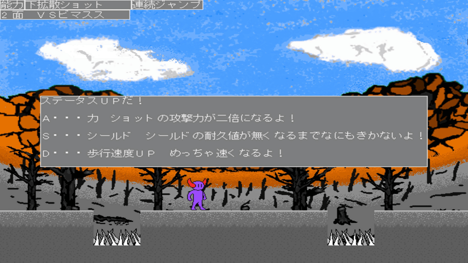 不思議なキャラたちが出てくる短編2Dアクションゲーム! ダメージを与える方法を探して戦うボス戦のゲームとステージ毎に使える能力が増えていくゲームの2本立て!
