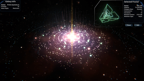 Music is your universe. Explore a customizable sandbox universe driven by music. Create beautiful fractal patterns and dazzling lightshows as you navigate this unique, audio-reactive simulation. Play your own music and tweak the visuals as you desire.