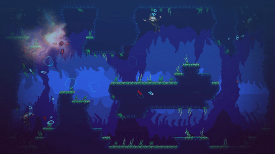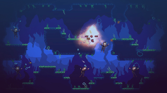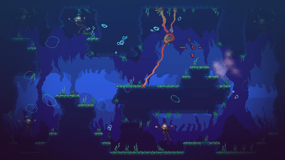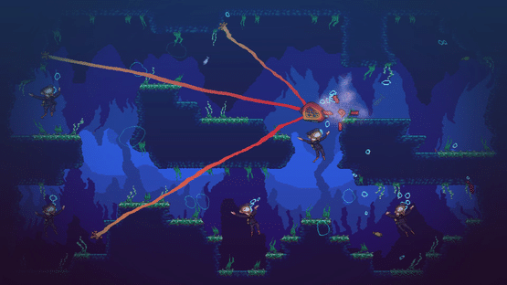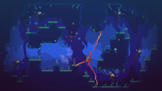 UnderWater Rescue - A platformer with physical controls for a three-limbed robot that clings to ledges and makes its way through the underwater world, avoiding collisions with missiles and collecting divers on board.