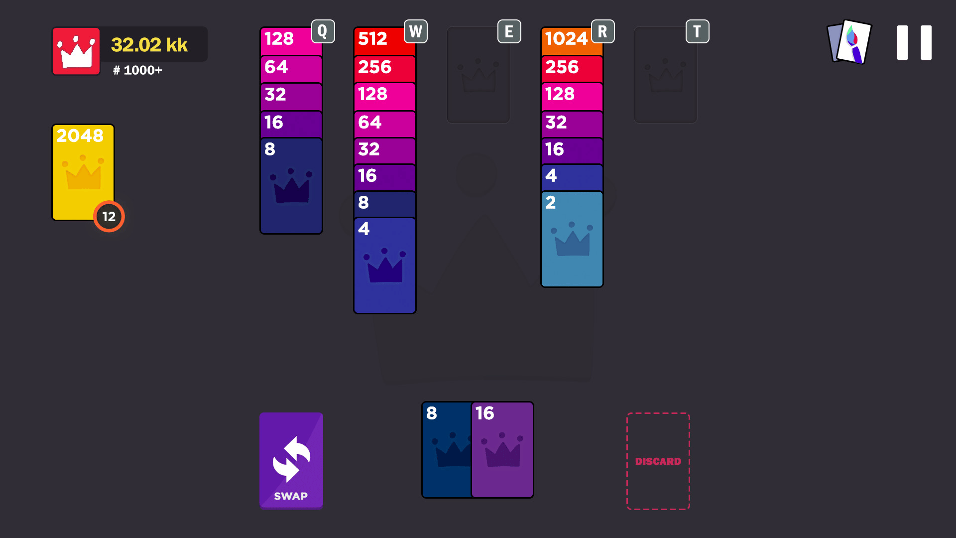 2048 is a classic puzzle with a simple goal; reach 2048. Move your tiles across the grid and merge identical numbers into one. Plan ahead and watch out for new tiles spawning, that may prevent you from joining your numbers.