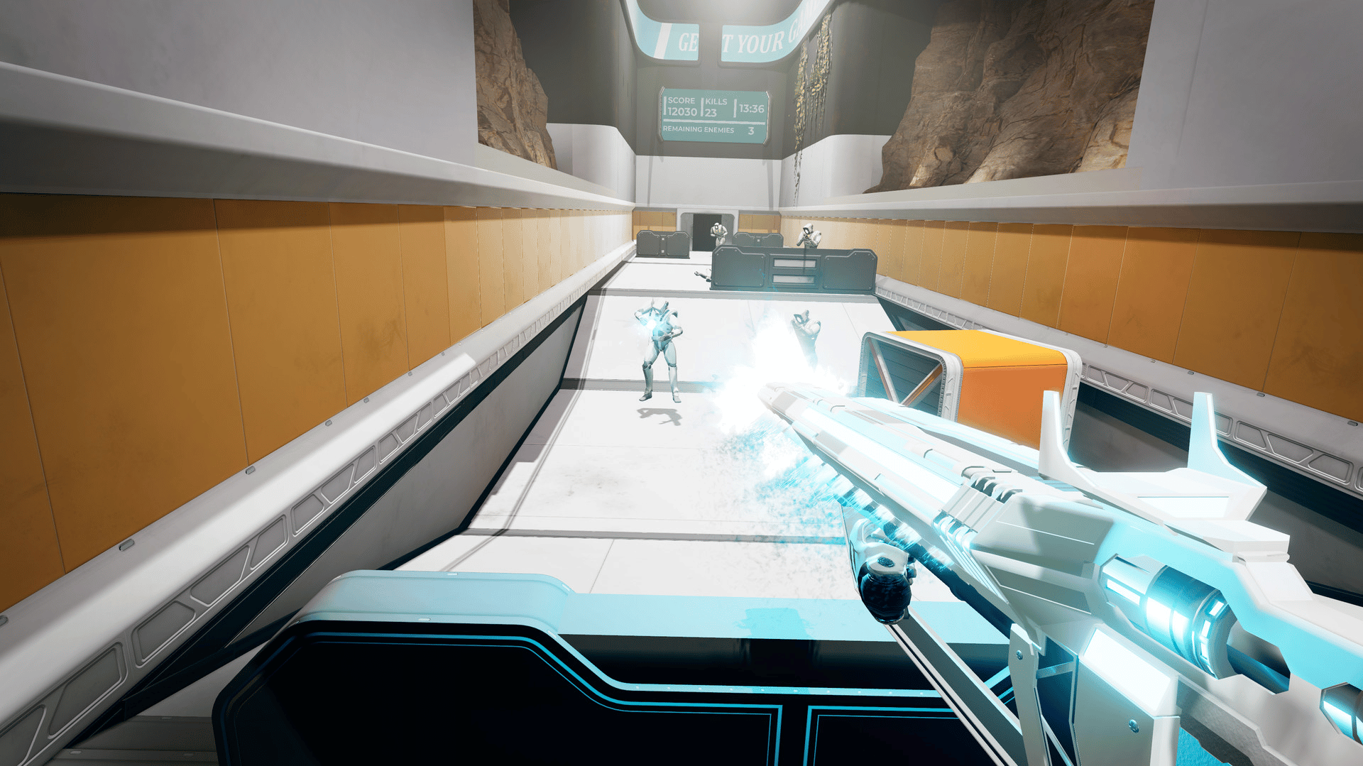 Dynamic Arms VR is a first-person Sci-fi shooter where you utilize transforming weapons, so-called "Dynamic Arms", to fight your way through waves of robot assailants in the arena. Will you make it to the top of the scoreboard or will you face defeat at the hands of your mechanical oppressors.