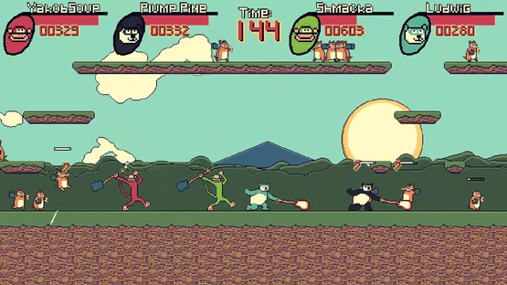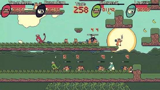 Bass Monkey is a musical album set to a cartoony, hack n' slash arcade game! Assemble your band (up to 4 players) and play as a bass swingin' monkey or guitar swingin' panda! Collect bananas, smack away your fans, and top the (high score) charts before the album ends!