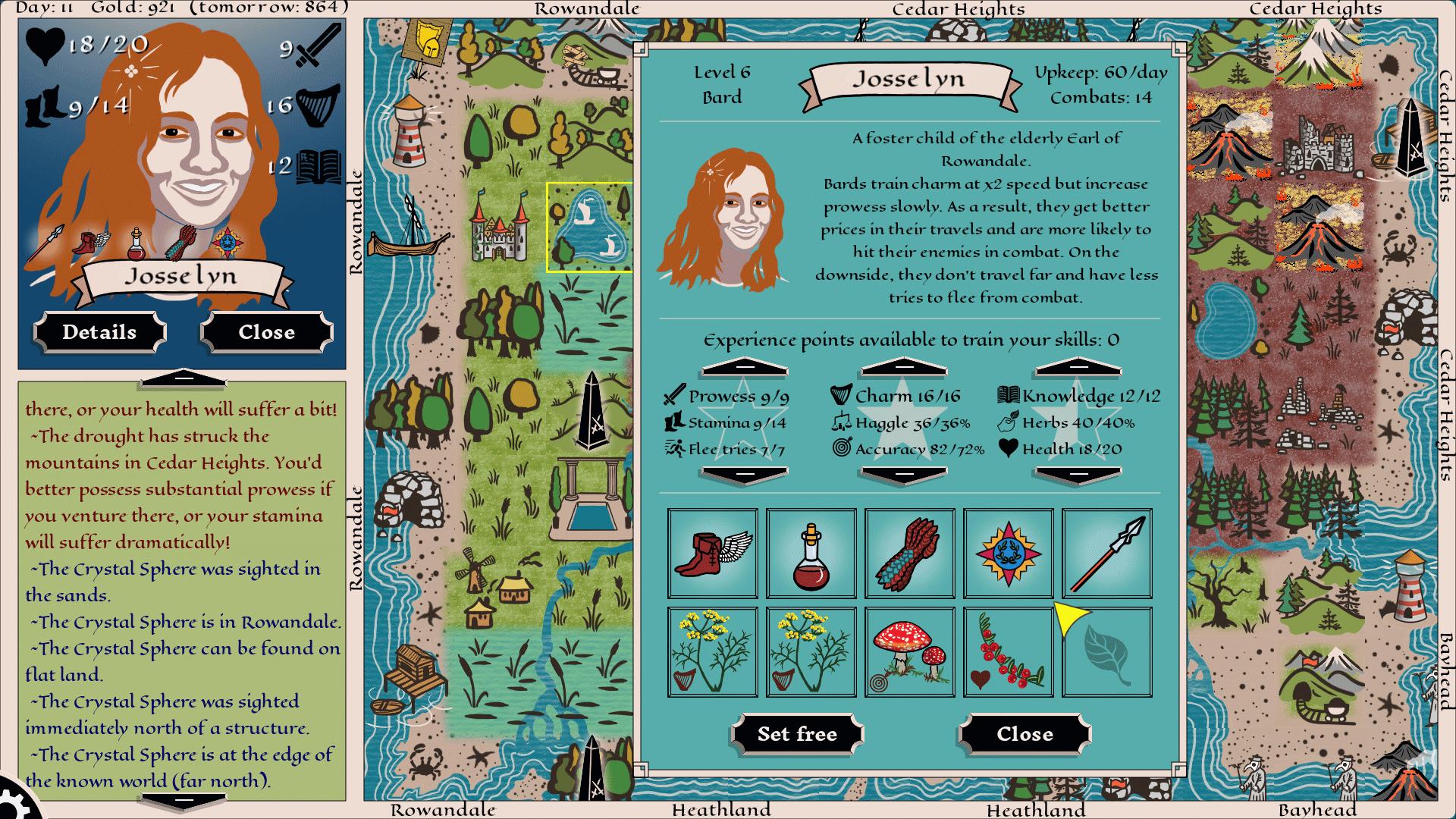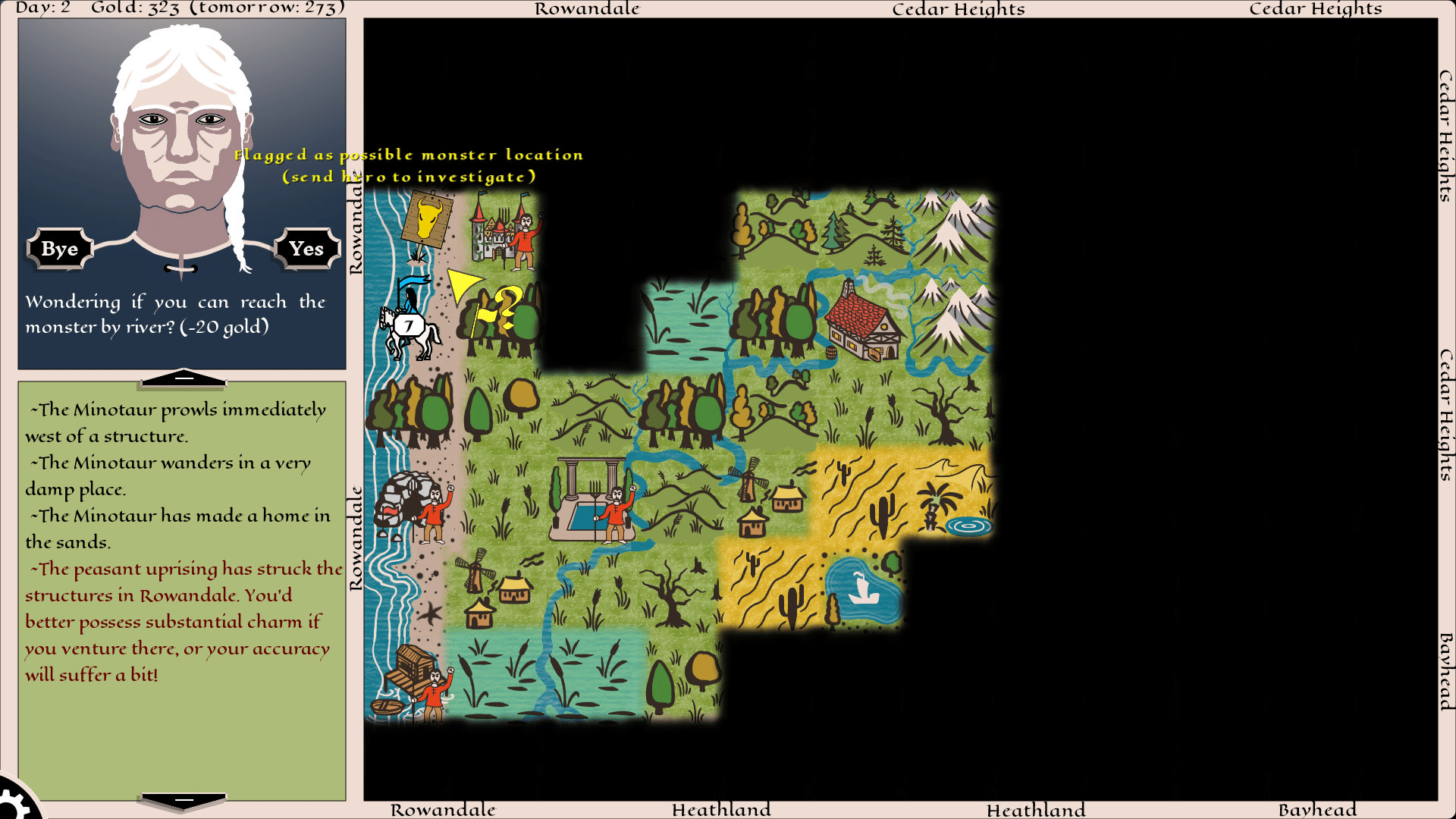 Fireside Hero is a compact strategy with an old-school look and a puzzle twist! Can you find and defeat five legendary monsters in twenty days? Plan your moves carefully - the lair may be right in those woods! Buy rumors, hire adventurers, explore the map, and win tactical combats.