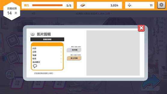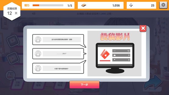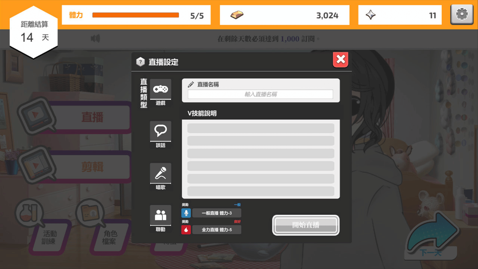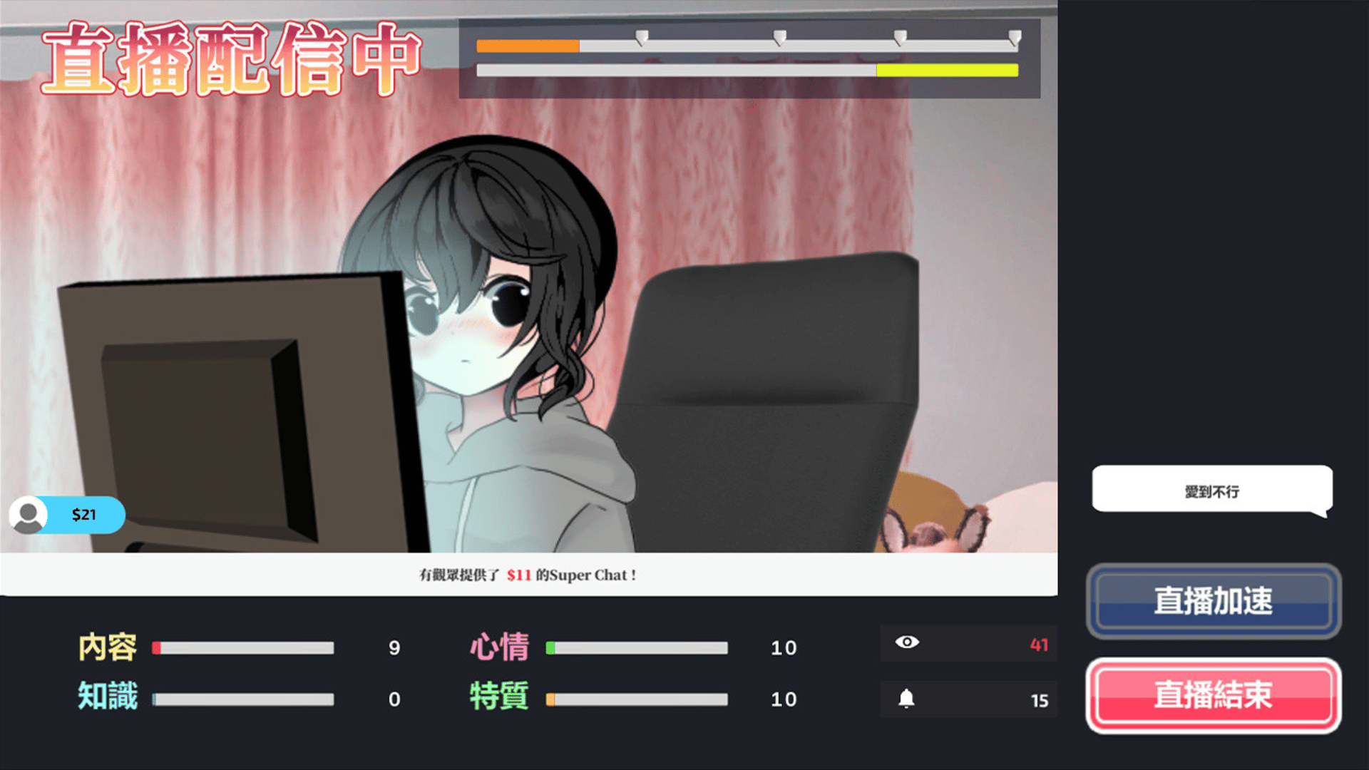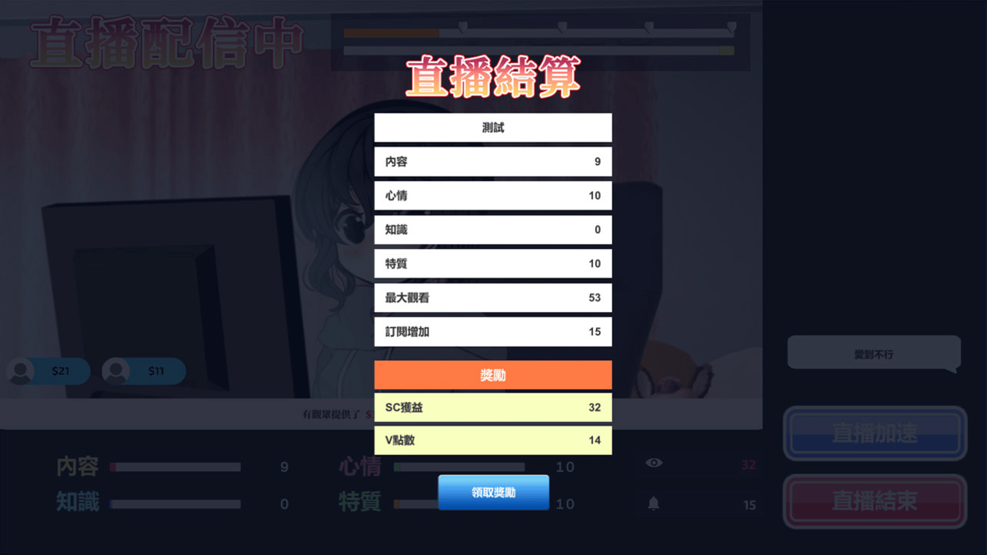 A simulation game where you're a Vtuber and need to reach milestones to improve. You can train yourself and stream.