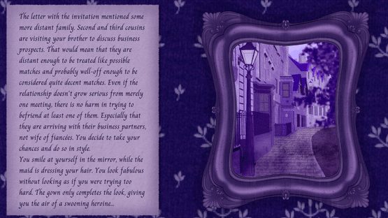 Simple visual novel in which you play as a young upperclass woman preparing for her debut before the Queen and her royal relatives. All of your decisions lead to one of four very different endings. Who will you become? The jewel of the season or the outcast, never again mentioned by your family?