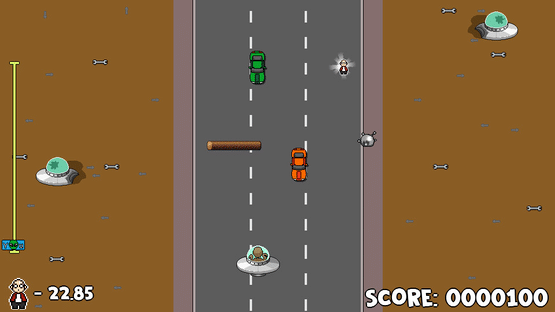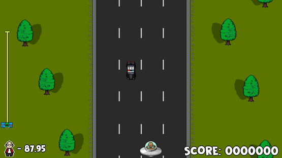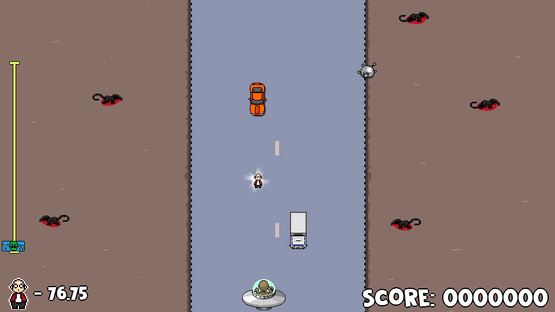 Alien Accident is a top-down race, a flying saucer and oncoming traffic. It is necessary to collect people for fuel. Do not accelerate too much, fuel runs out much faster. Use trampolines when flying over cars. Your people believe in you!