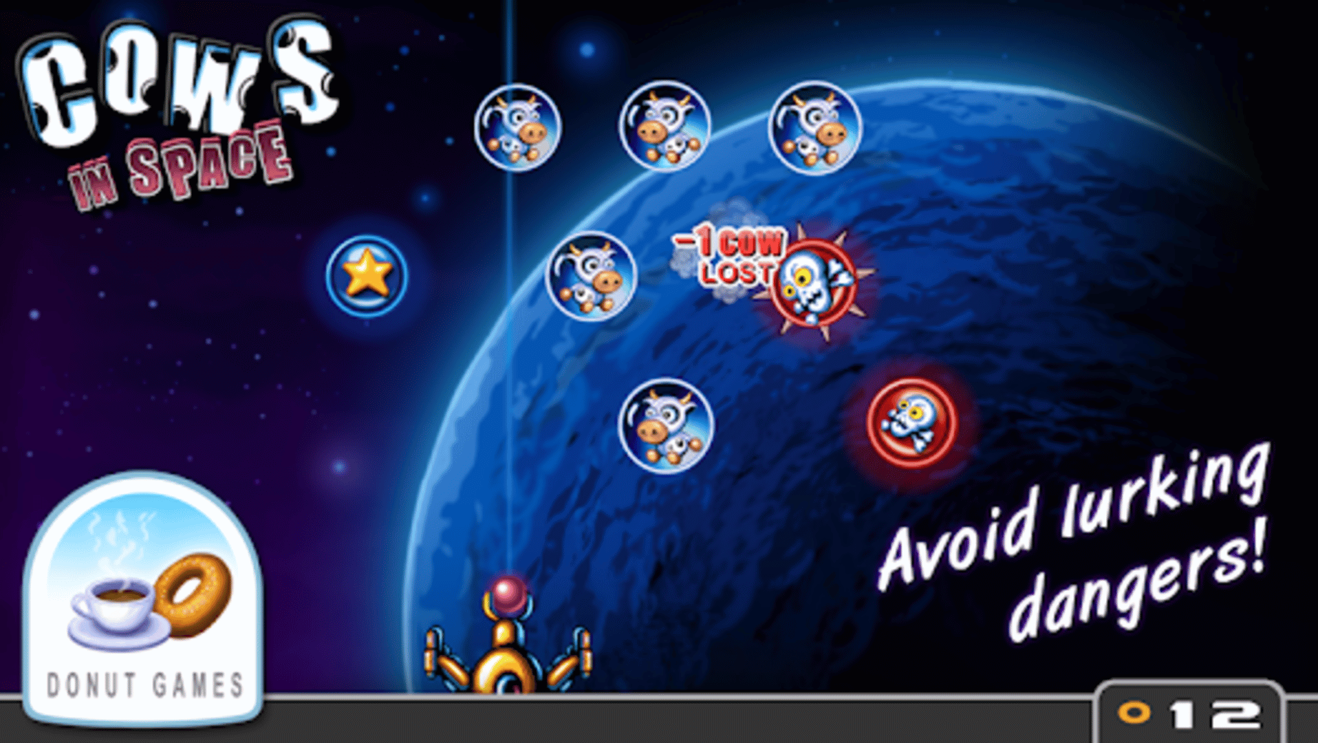 In a failed galactic operation, the cows of earth have ended up floating around in space - encapsulated in air bubbles. Brave space pilot, it's time to charge your jelly beam and get ready for an intergalactic mission to teleport the cows back to earth!