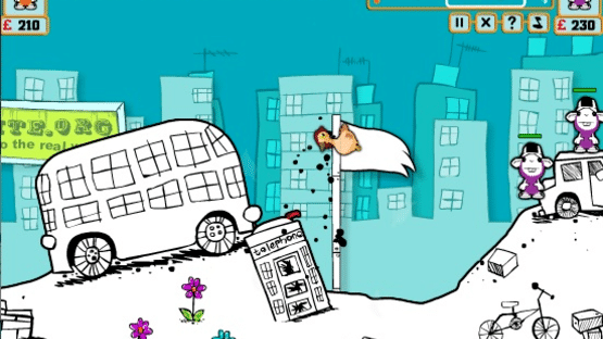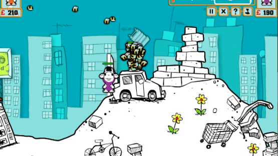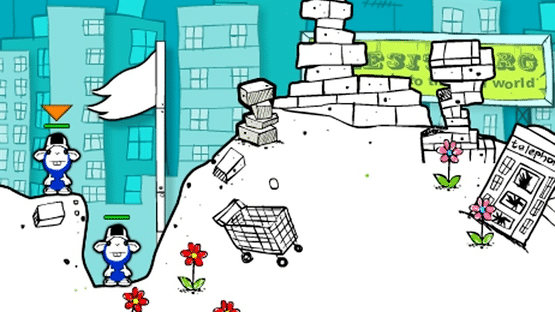 Four rat-looking characters in a black & white world throwing diverse items at each other, such as bee hives, paint buckets, boomerangs, eggs, etc. Similar to Worms in gameplay.
