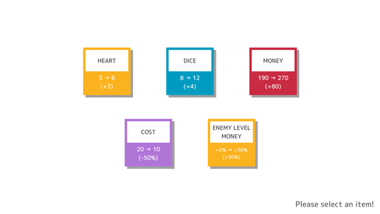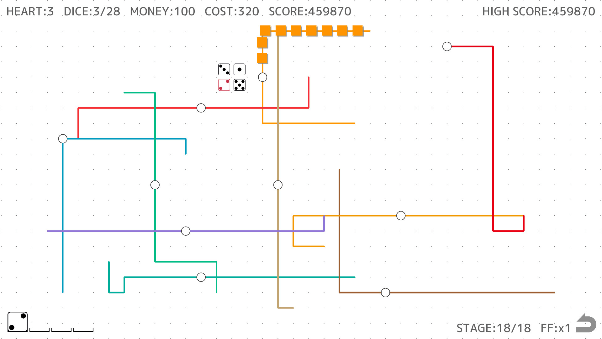 This is a tower defense game where you use four dice to build a turret. The rolls of the dice are the ability value of "number of shots", "time reload", "damage(& range)" and "magazine". Try your best to clear all 40 stages, which are getting more and more difficult!