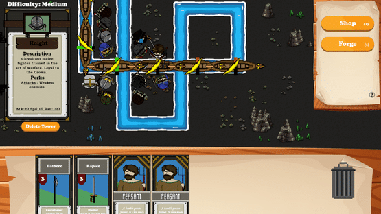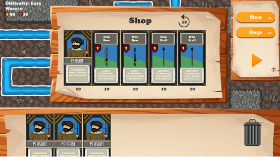 Peasent TD is a fantasy tower defence game with card game elements. Towers are built and upgraded through cards that are bought in the shop or crafted from the forge. This means every game will be unique, you will not be able to rely on a specific build order or strategy. Adaptation is necessary.