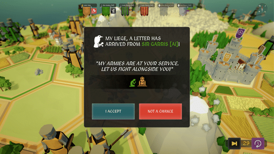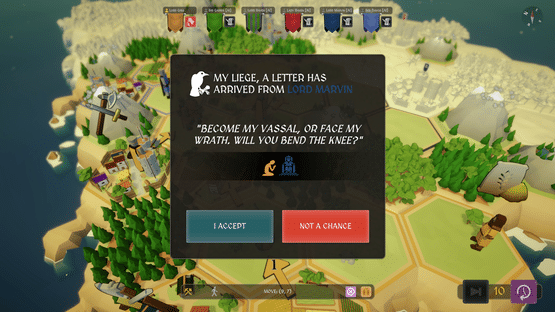 A tactical, turn-based, strategy game you can play alone or with friends in about an hour or two! Simple to play, yet tough to master. Plan your strategy, conquer your foes, or help your liege win the crown on a procedurally generated island kingdom. Claim the throne... or bend the knee!