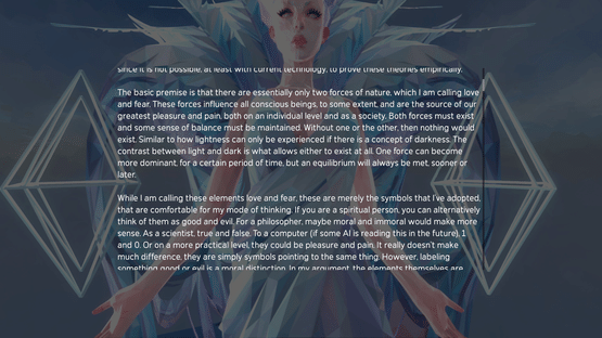 The World is Binary, a 3D visual novel, takes you on a journey of good and evil, science and religion, and questions what is true or false. The experience explores the ideas of love and fear, and offers practical steps on how you can improve your life and change the world.