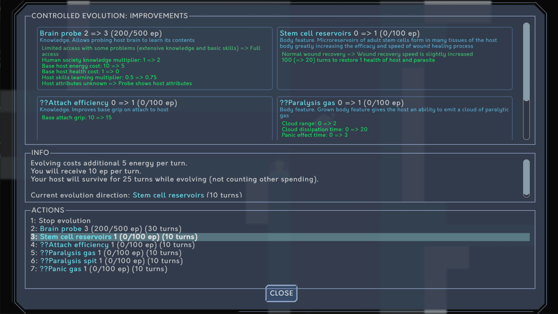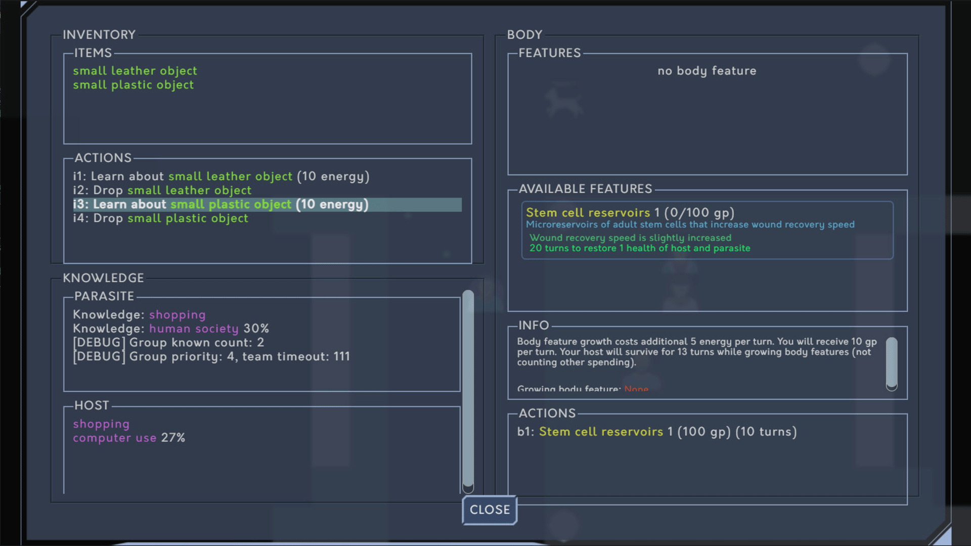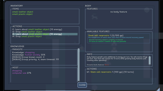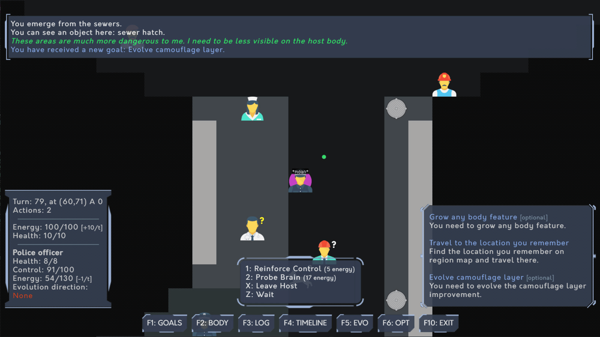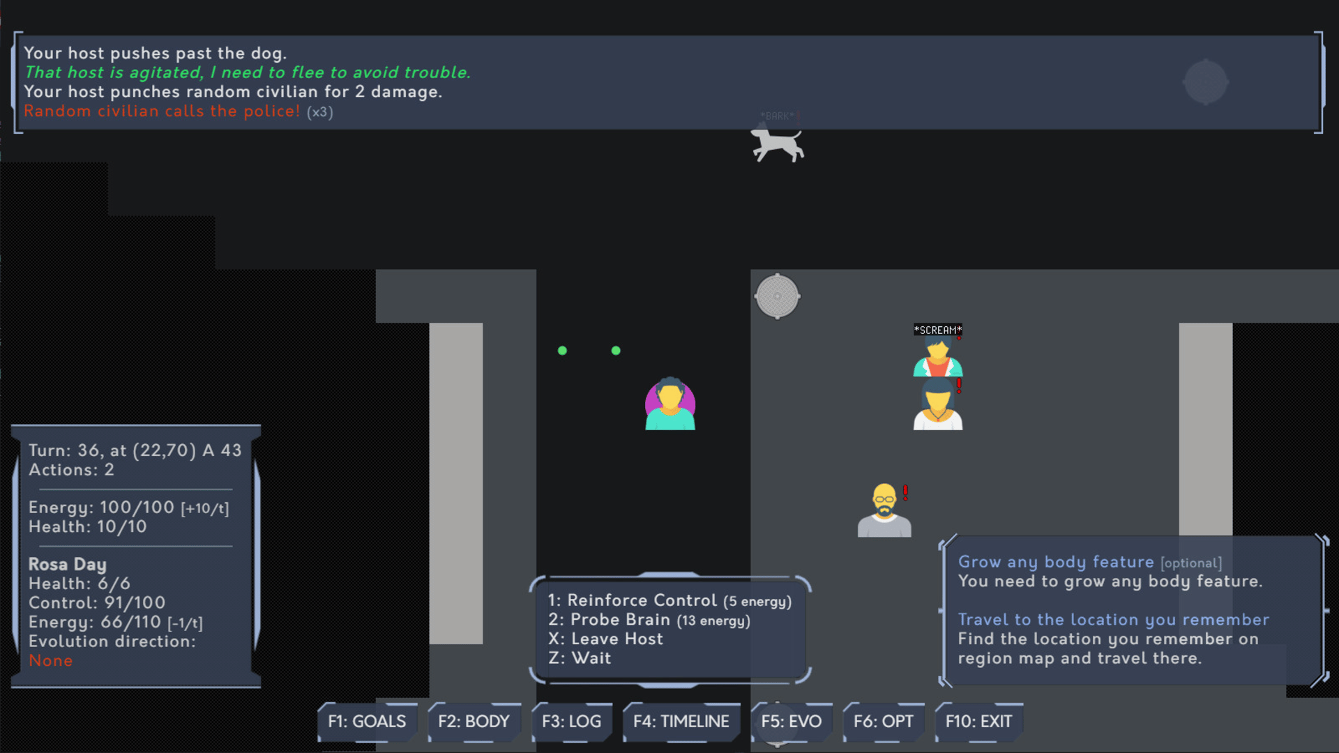 This is a roguelike open-world sandbox survival horror set in a modern city. Play as an --redacted-- parasite, possess human hosts, exploit and evolve them to help you survive in a hostile world, all to find out your one true purpose.