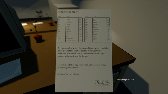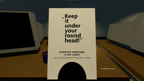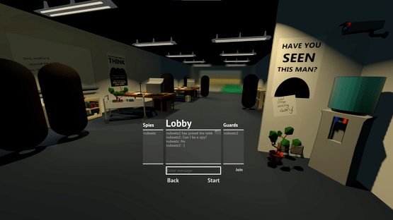 First person team multiplayer game. On closed map, battle between Guards and Spies. Spies team need to find locked filling cabinet and documents with parts of the password. Guards team need to find Spies, judging on the basis of spy movement or behavior.