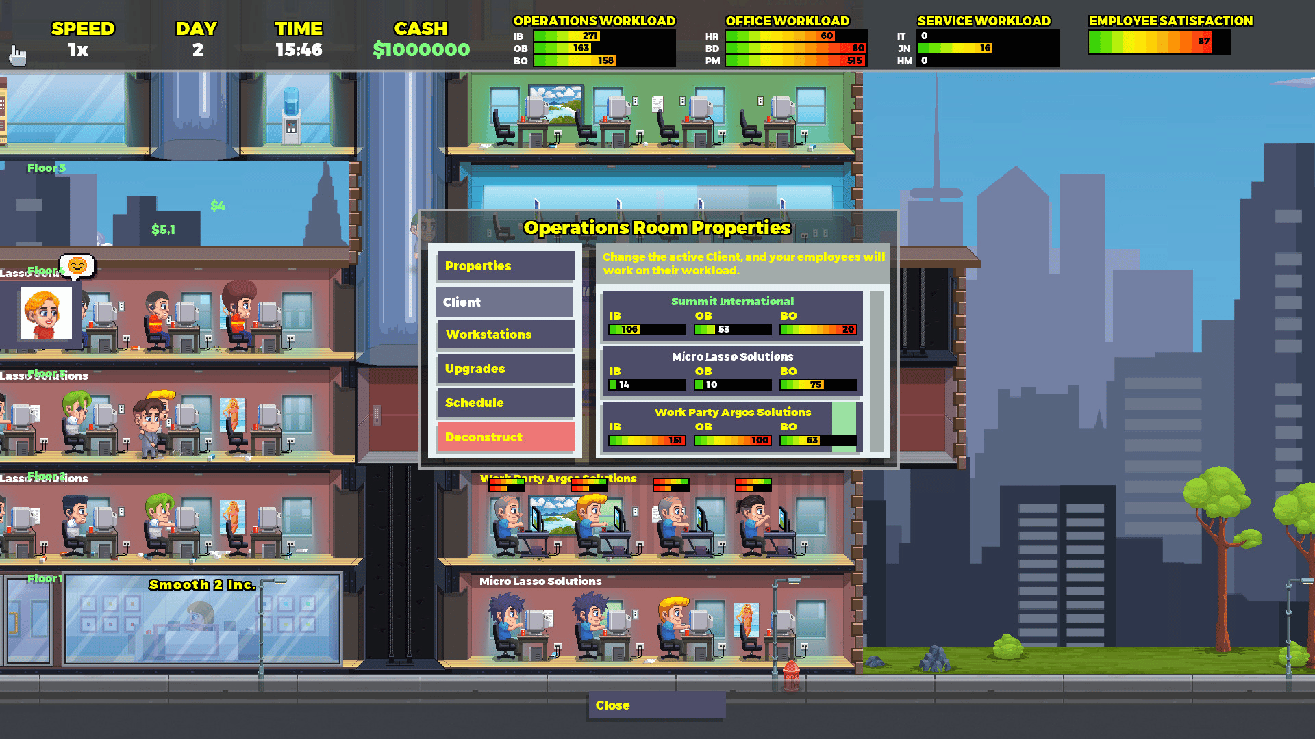 Welcome back to Smooth Operators 2! Smooth Operators is an advanced simulation where you take control of a customer service company and lead it to financial success! Hire employees and customize your buildings with different types of offices, facilities and accessories!