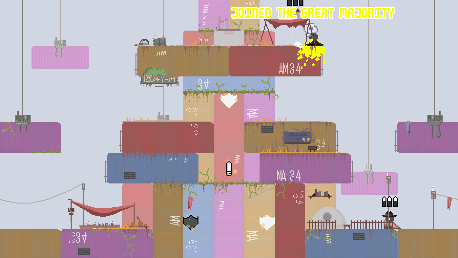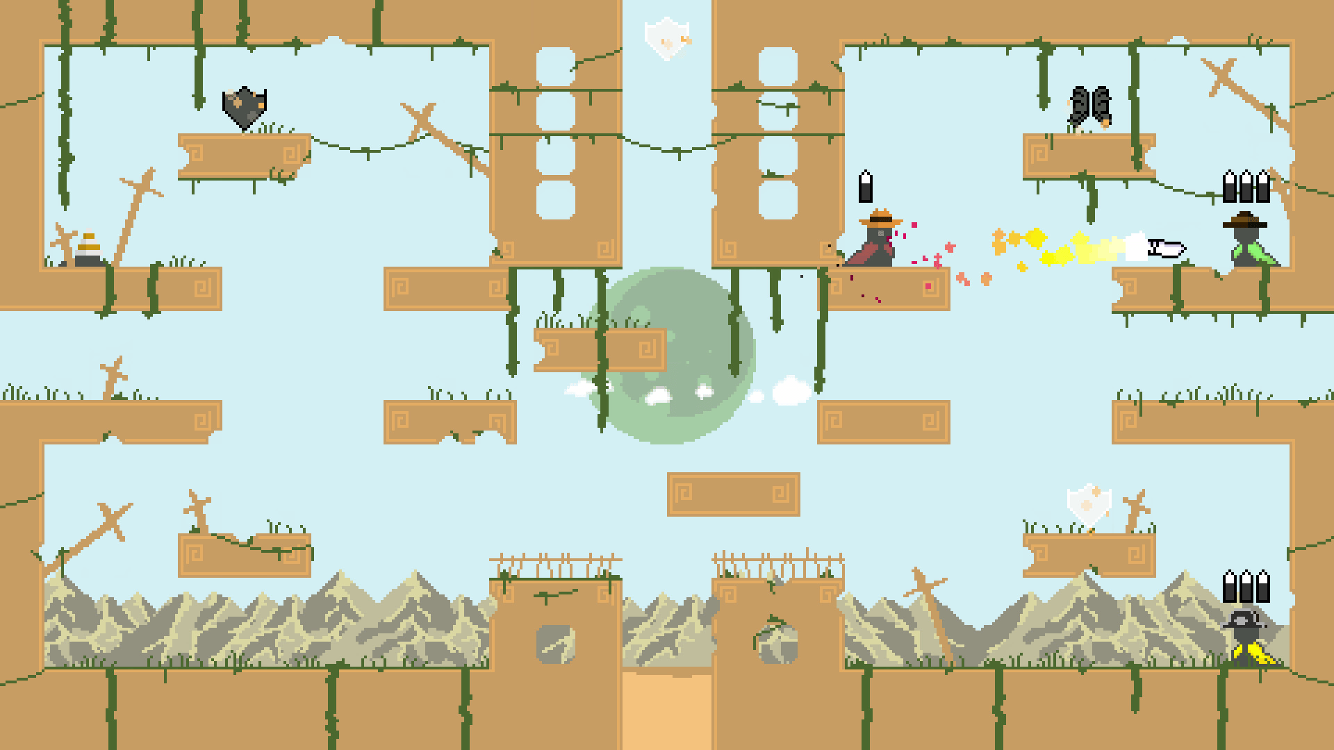 A frenetic local multiplayer arena combat game for 1-4 players. Jump, dash, and shoot your way to victory, making use of an array of powerups like shields, cloaks, and jetpacks.
