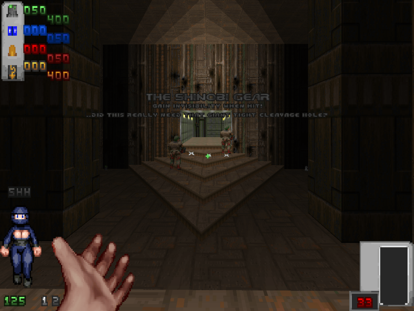 This is a weapon mod that does not touch the monsters in anyway. Well more of armor mod, or maybe half of both? Your armor/clothes is your main core of health and well being, your weapons are enchanted by what you wear They are not eternal, they will break eventually, and when they do, you are in trouble as going all naked makes it hard to handle guns if you wanna stay modest. Luckily there is plenty to choose from, but you can only wear one at a time, so sometimes you might need to strip on purpose. All weapons except chainsaw have been replaced with counter parts. Medikits and bonus shards give clothing scrap which repairs armor instead of restoring health Berserk, chainsaw, armors, megaspheres, radsuits, invulnerability and invisibility spheres have cloth replacements, tho the invulnerability one can be a bit more... aggressive clothing. All weapons have alt fires and some even have reload based specials, make sure to bind those and the mod specific strip button so you can pick up those new enchanting clothes. Free look is recommended as some guns might not properly behave with mere autoaim.