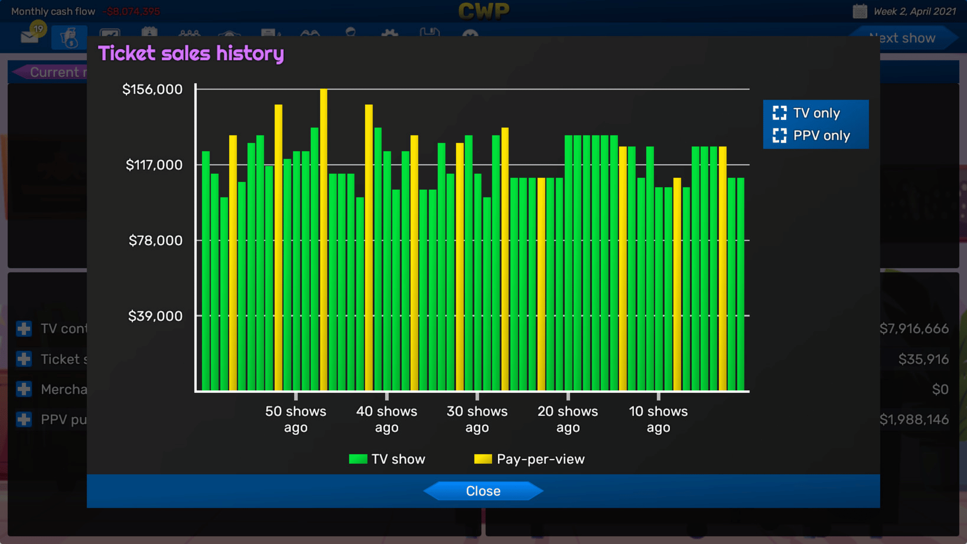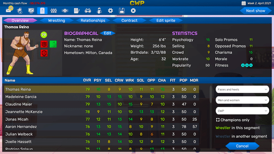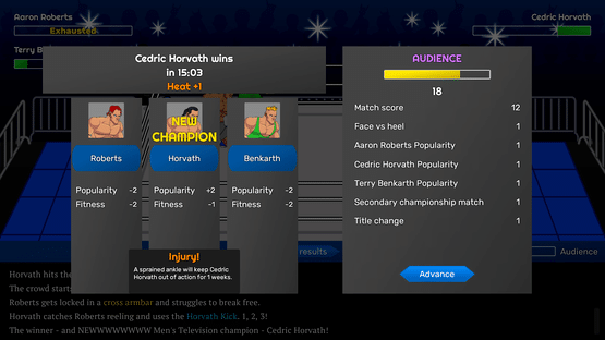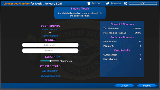 Book shows, build feuds, manage your finances, and win the TV ratings war in Championship Wrestling Promoter, a professional wrestling management strategy game.